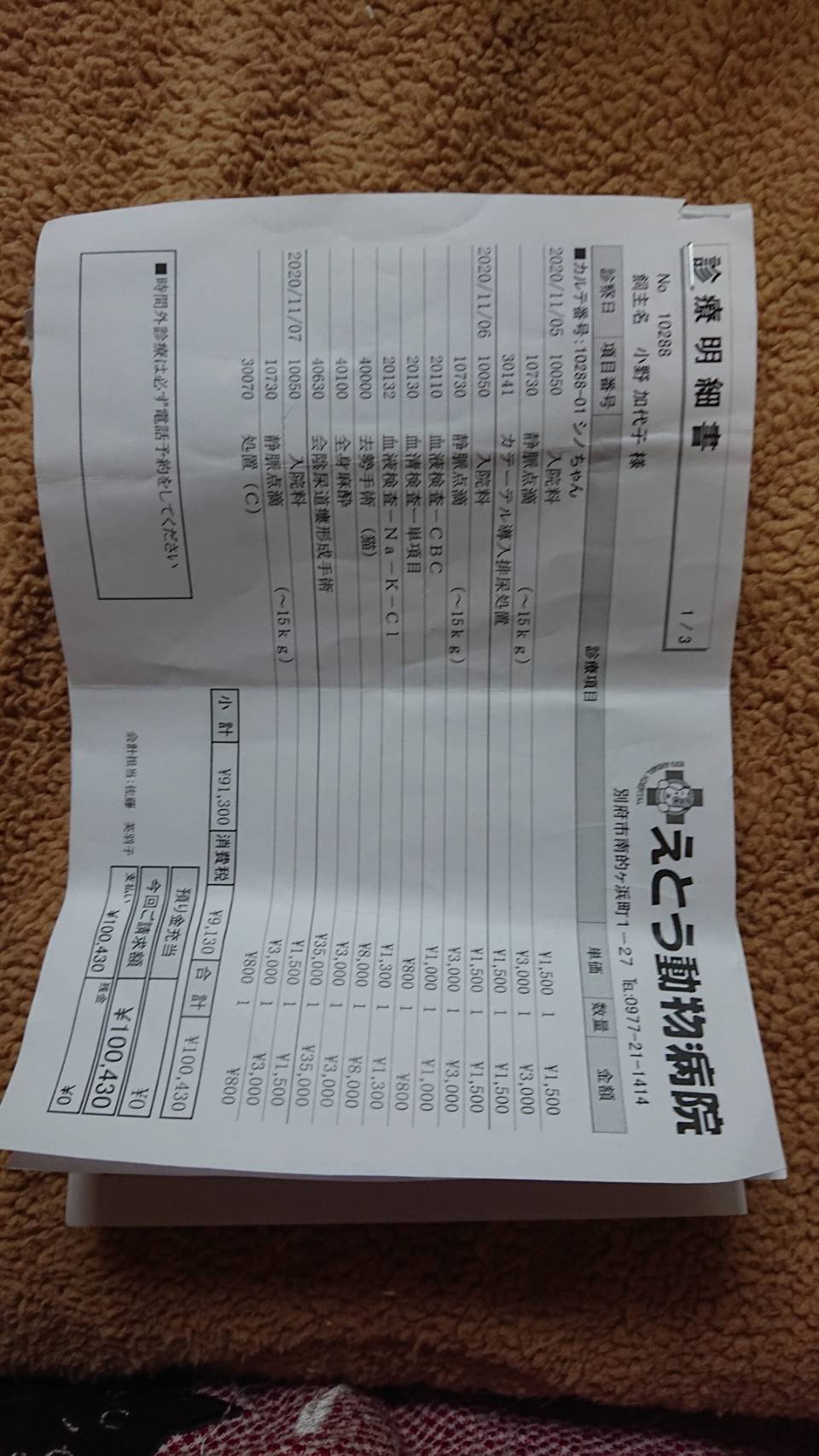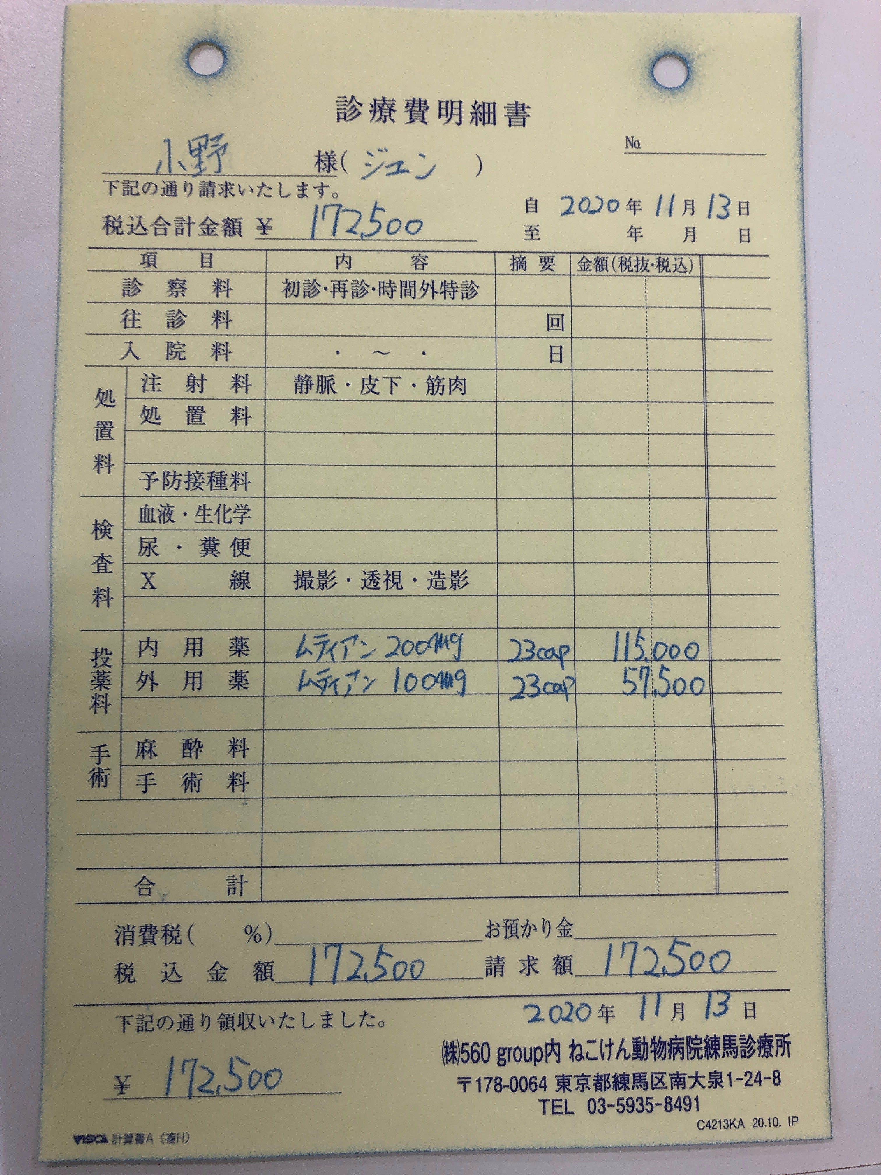 MUTIAN薬代165000円(1ヶ月分)×約84日分×2匹分