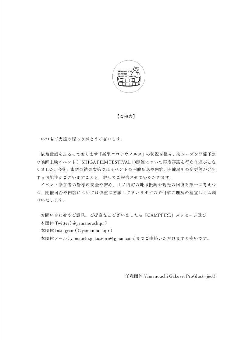 冒頭に掲載した文書の通り、当団体で開催に向けて検討を重ねていた長野県山ノ内町志賀高原における映画上映イベント「SHIGA FILM FESTIVAL」につきまして、新型コロナウィルスの感染収束の見通しが立たないため、一度開催を再審議することと致しました。