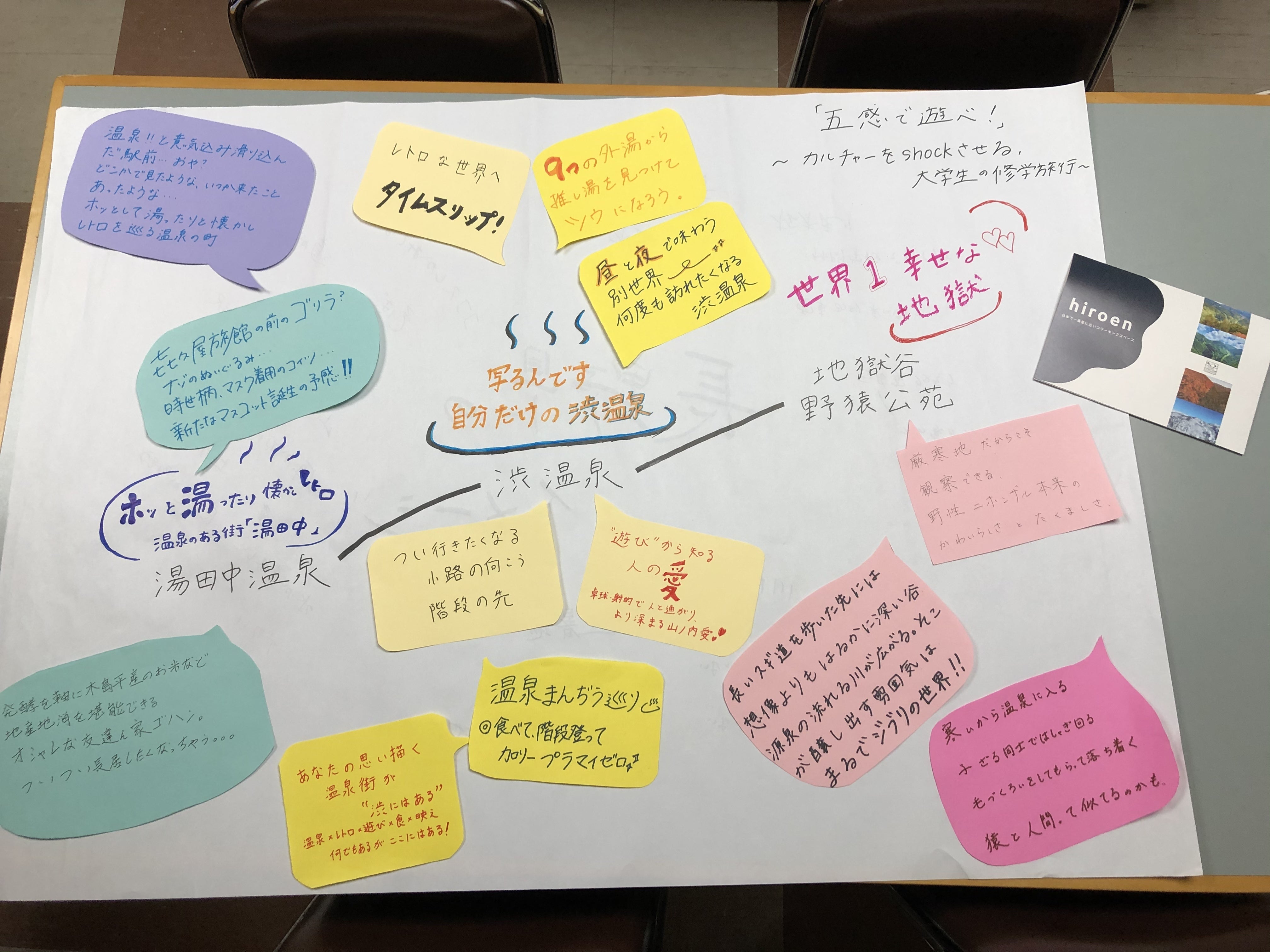 イベントでは山ノ内町の主要観光地である湯田中温泉、渋温泉、地獄谷野猿公苑の3箇所を巡りながら自分の感じたことを言葉にする事に取り組みました!そしてその言葉を具現化する1つにマップを選び、自分の言葉でマップ作成を行うという「何かを成し遂げる経験」を目指しました!