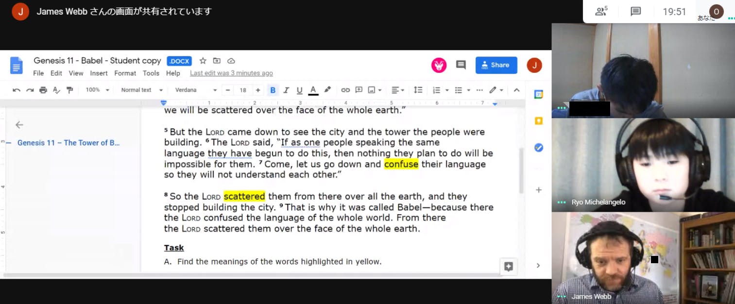イスラエル、イギリス、台湾、日本・・・4つの国のキリスト者の手による学びの場として誕生した、クリスチャン・ミニストリー「ビニンセン・エンタグリッシュ」は、世界初のオンライン国際アカデミーです。イギリスで実際に現役教師として活躍している先生、オックスフォード大学、トロント大学のインターンたちが、オンラインで英語だけでなく、算数、文学、演劇、社会、理科そして、聖書を英語でレッスンしております。オンラインである特徴を活かして、台湾と日本の青少年を同時に指導し、教師たちもイギリス、カナダ、台湾、日本と様々な国から中継で子供たちを教えています。
