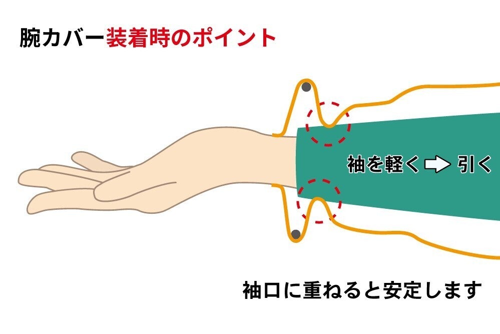 ・手首のゴムはフリーサイズです。密着がゆるい場合は、上にズラしてご使用ください。