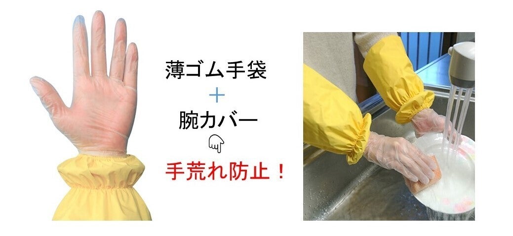 【応用編】水の扱いや洗剤での手荒れに悩む方には、薄手のゴム手袋の上から「リング付腕カバーぬれないわ」を使用されることをお薦めします。