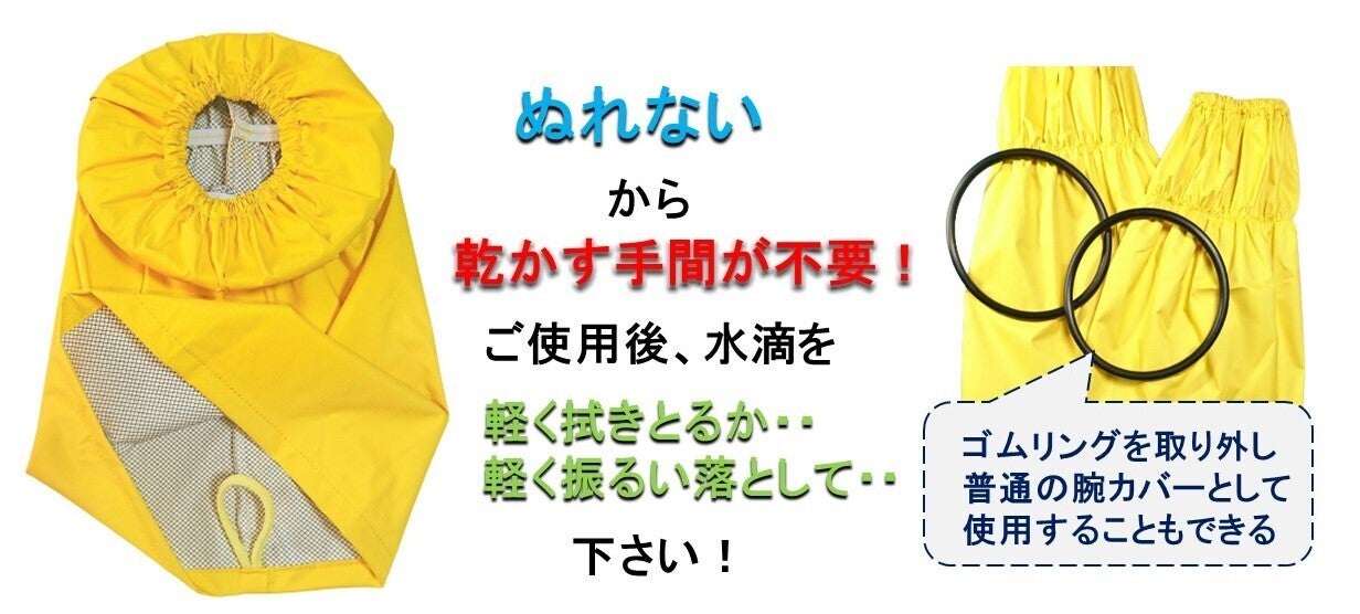 「リング付腕カバーぬれないわ」は、防水生地の腕カバーと柔軟なゴムリングの組合せによって、ペラペラで形を持たない防水生地が、日本刀の鍔(ツバ)にも似た立体構造となり、手首部分が10cm程ふくらんでいるのが特徴です。