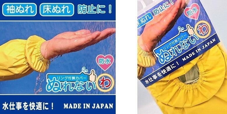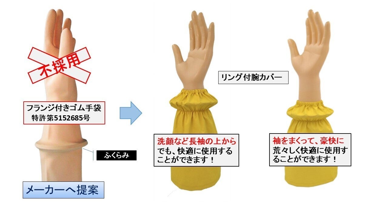 ゴム手袋とゴムリングの組合せで、今までのゴム手袋に水を遮る機能が生まれたこの商品を埋もれさせたくないとの強い思いから、その後も諦めることなく、特許権を保有しながら発想の転換を膨らませていたことで、ゴム手袋の手先をカットした「リング付腕カバーぬれないわ」の開発に繋がりました。