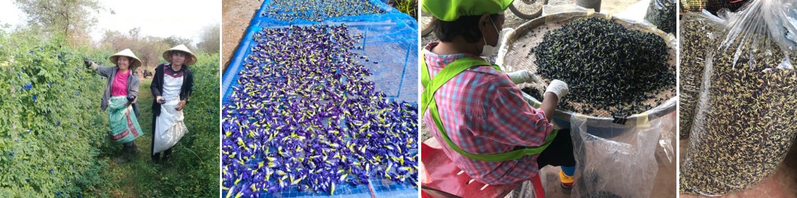 幸せを呼ぶ青い花 バタフライピーは近年国内外で注目を集めている農作物です。ラオスは暖かい気候で土壌もよく、農薬を使っていない土地がたくさんあるため、その栽培に適しています。