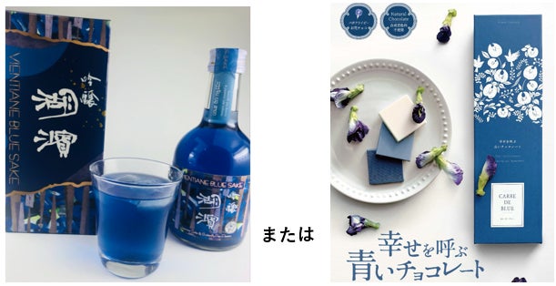 100,000円 ソンパオから絵葉書、バタフライピー乾燥花(20gx5)、ヤオ族刺繍のミニバッグ、青いお酒x3(ヴィエンチャンブルー酒、吟醸 湖濱)または青いチョコレートx3(カレ・ド・ブルー)
