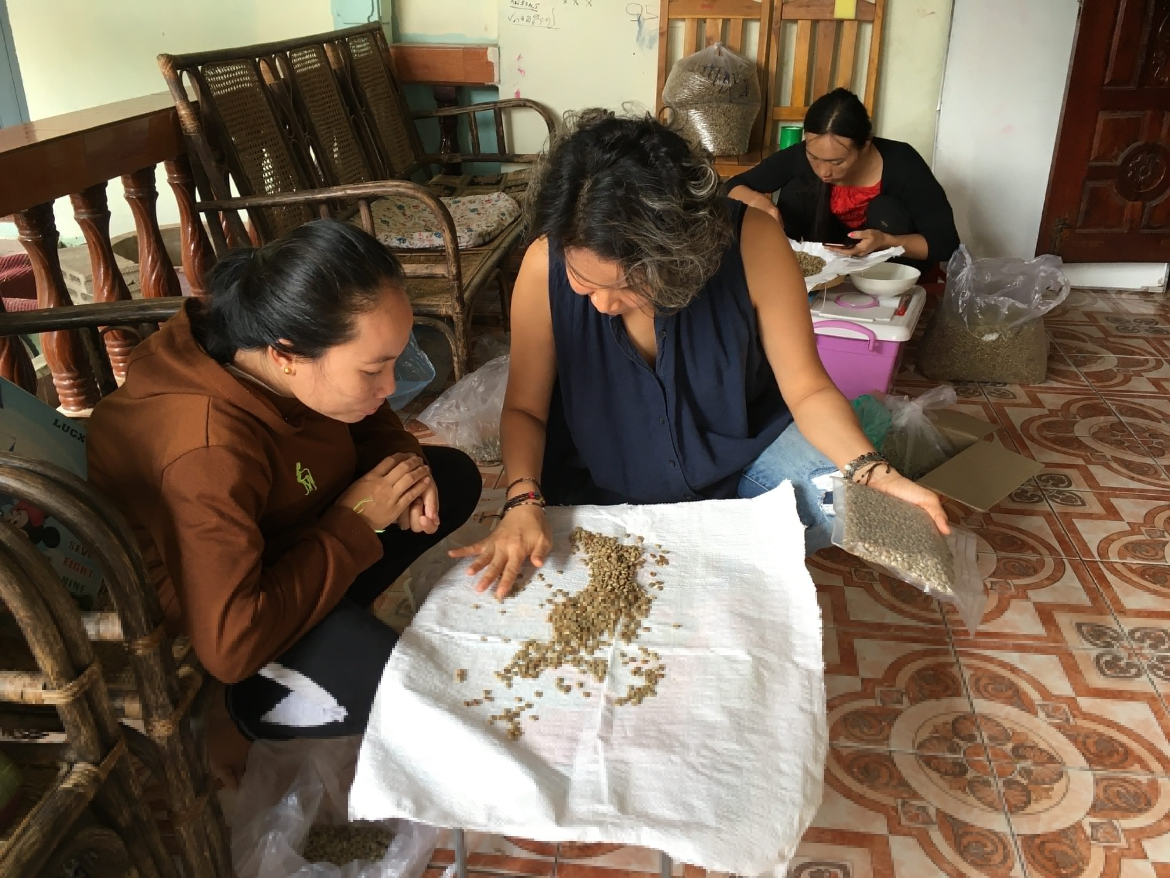 コーヒー豆の選別についてソンパオのメンバーにルールを教えるヌイさん(右)