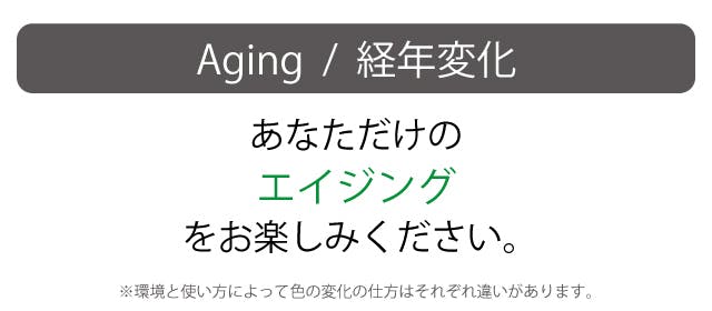 使用しているIL PONTEの『MAYA(マヤ)』は、吟擦り加工(表面を擦る加工)が施されており、吸い付くような肌触りが特長的です。エイジング(経年変化)が早いため、味わい深い色へと変化して行きます。使い方によってエイジングの仕方も様々です。あなただけのエイジングをお楽しみください