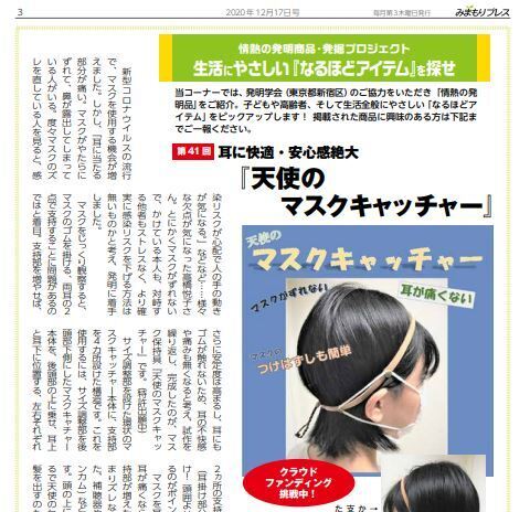 クラウドファンディング開始から4日目となりました。ご支援頂いたみなさま、情報を拡散してくださったみなさま、本当にありがとうございます。おかげさまで、現在目標金額の46%を達成しております。さて天使のマスクキャッチャーですが、この度「みまもりプレス」というメディアに紹介いただきました。「みまもりプレス」の記事はインターネット上でも公開されていますので、良かったらご覧ください。みまもりプレス(3ページ目)http://www.mimamori-j.jp/pdf/mimprs042_20201217_1900.pdf高齢者関係の情報誌です。【天使のマスクキャッチャー】は子ども~高齢者まで使えます。みまもる人、みまもられる人、どなたにでも使っていただけると思います。ご両親へのプレゼントにも如何ですか?もしまわりの方で、マスクをお使いの際にお困りの方がいらっしゃいましたら、ぜひおすすめいただきたく存じます。よろしくお願いいたします。