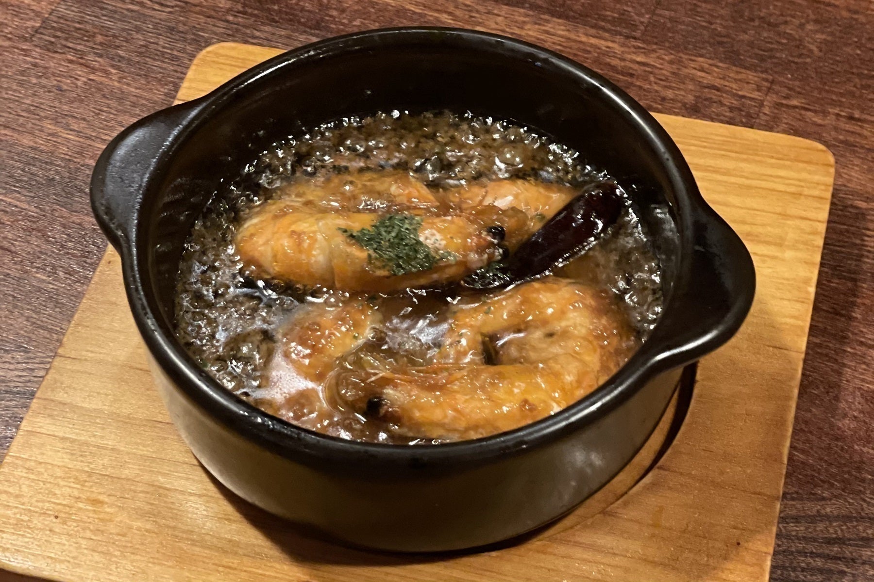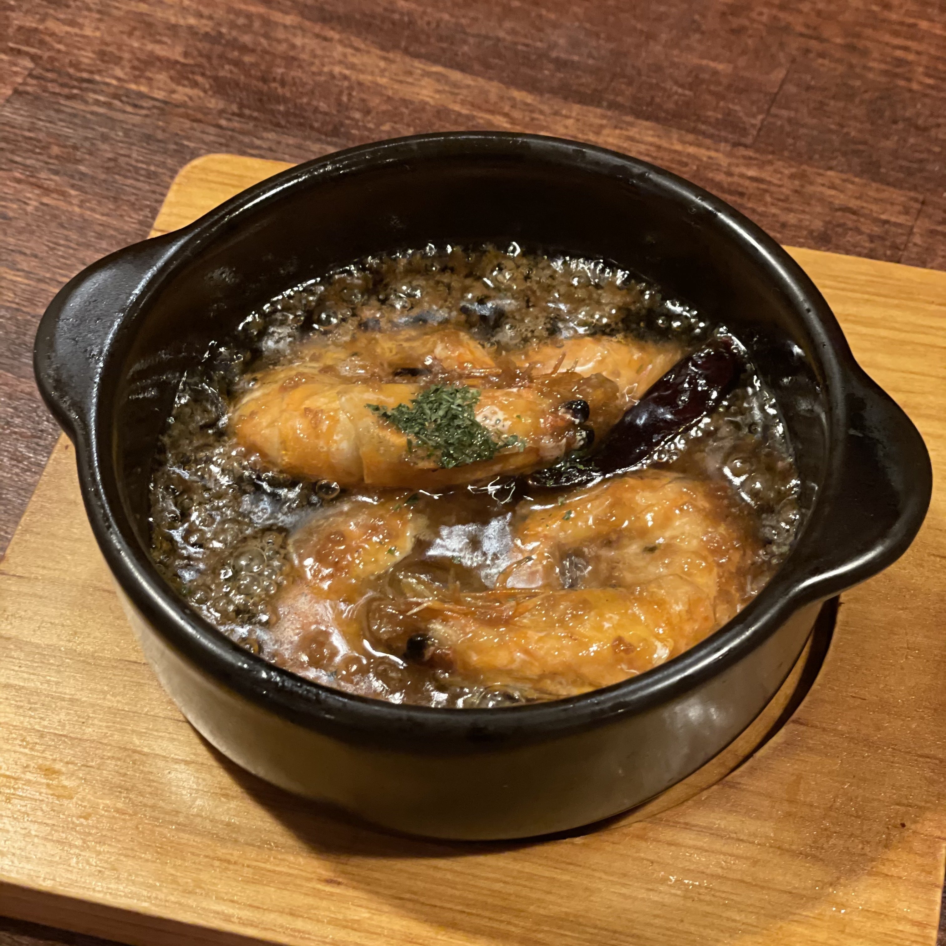 耐熱の陶器にて熱したオリーブオイルごと提供されるスペイン料理の一種で、マドリード以南の代表的な小皿料理(タパス)です。