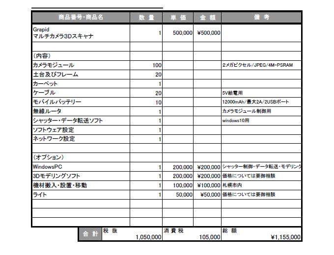 (オプションのWindowsPCと3Dモデリングソフトを抜いた)715,000円を機材購入に充てさせていただきます。