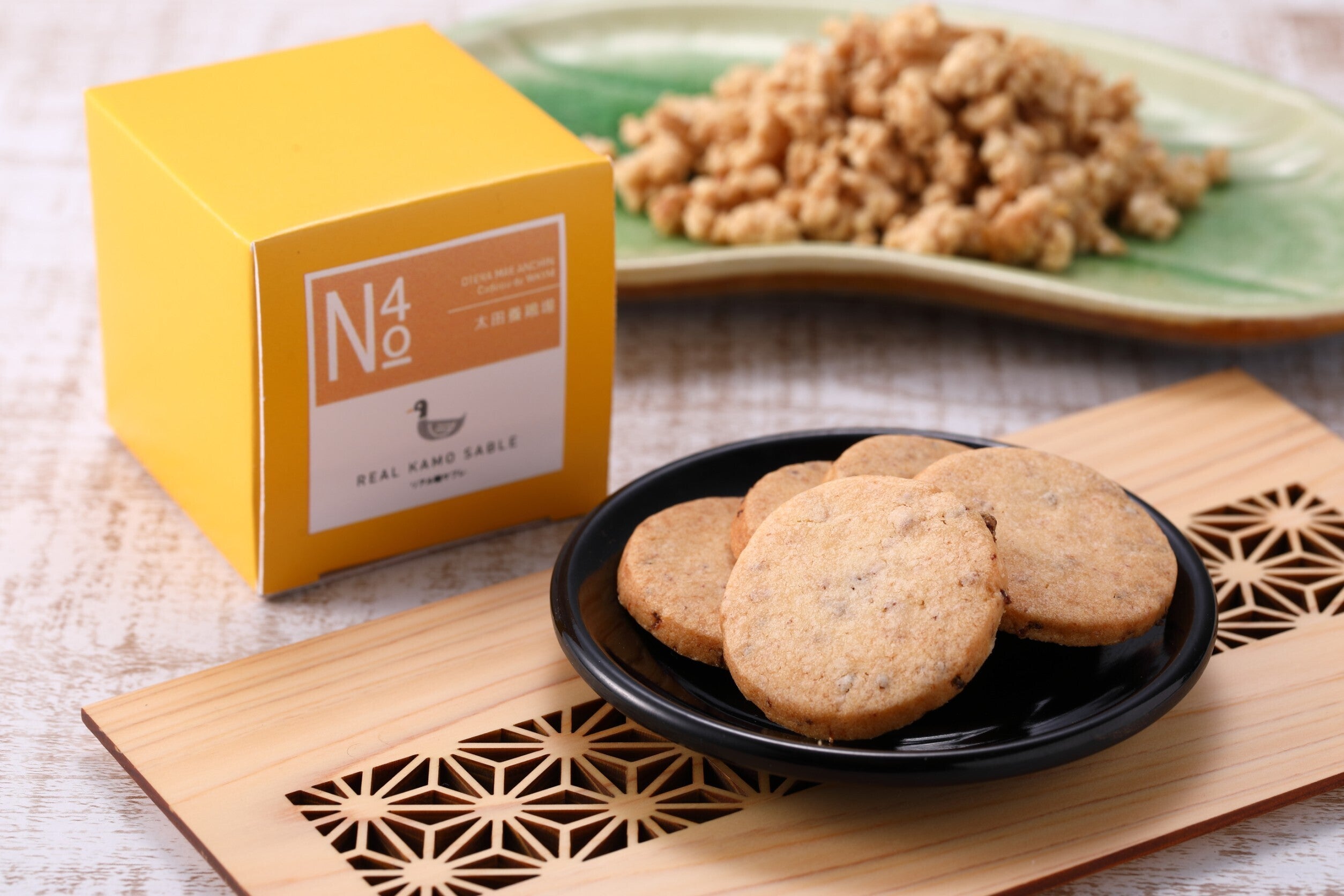 弊社でのびのびと育った紀州鴨は、真っ白い油と鮮やかな赤みの肉のコントラストが美しい外観を持ち、鴨肉独特の臭みが少ない、しかしながら濃厚な脂のコクがある最高級の紀州鴨になります。その紀州鴨のミンチを醤油ベースのたれでふっくらと炊き上げ、たっぷりとサブレにトッピングしています。サブレとリアルな鴨の風味をお楽しみください。鳩サブレに鳩は入ってませんが、このサブレには、手間ひまかけて育てた紀州鴨が入っています!正真正銘、リアル鴨サブレです。