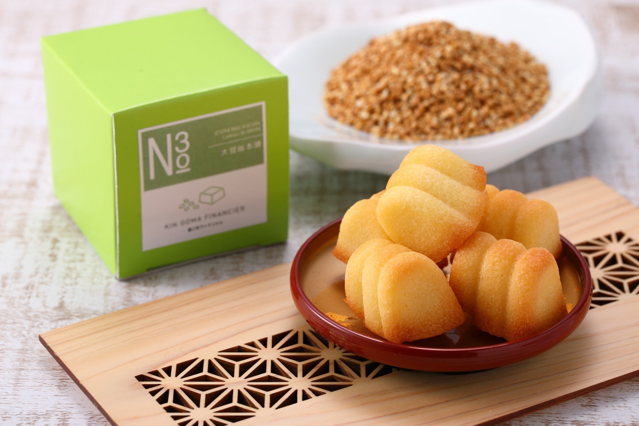 高野山に伝わる昔ながらの製法で作る余分な皮から雑味・油をすべて取り除きます。胡麻のペーストよりあっさりしており、胡麻油より胡麻の深みがあるごま豆腐の素になる金胡麻のごま乳を使用したフィナンシェです。 弊社は製造機械にもこだわっているので、キメが細かくなめらかな舌触りに仕上がっております。一口サイズで食べやすく、食感にもこだわり、胡麻の風味漂うフィナンシェです。あっさりしているので食べ始めると止まりません。
