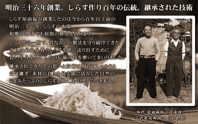 我々『前福』がございます和歌山県湯浅町は、海と山が広がる温暖な気候で、お醤油の香りが漂う醤油発祥の地でもある伝統ある城下町です。そんな湯浅町で前福は明治36年に創業し、創業以来鰯の稚魚であるシラスを専門に製造販売をおこなう『しらす屋』でございます。