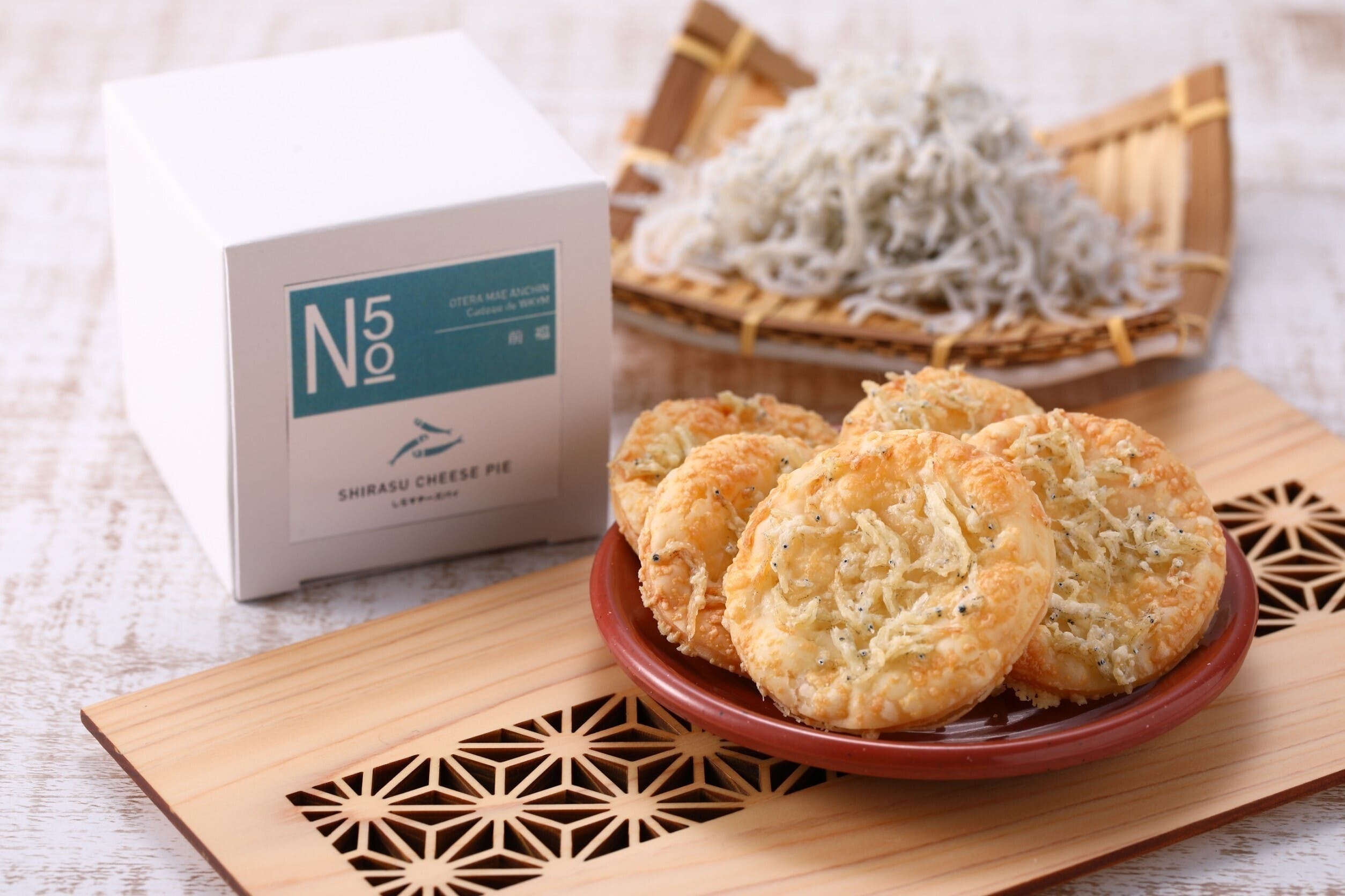しらすチーズパイで使用しておりますシラスは、湯浅湾沖で水揚げされた良質なものだけを厳選し使用しております。和歌山の山々から無数に流れる川によって運ばれる山の栄養分をふんだんに受けたシラスは、海の栄養分である動物性のプランクトンとのバランスが素晴らしく、もくもくと湯気が立ち昇る塩湯にサッと潜らせたシラスは、たまらなく良い香りと旨味が口の中に広がります。パイ生地との相性も非常によくあい、パイのザクザク食感にチーズとシラス2つの香りが重なるほんのり効いた塩味が、いろんな『おやつシーン』を楽しませてくれる贅沢なお菓子です。