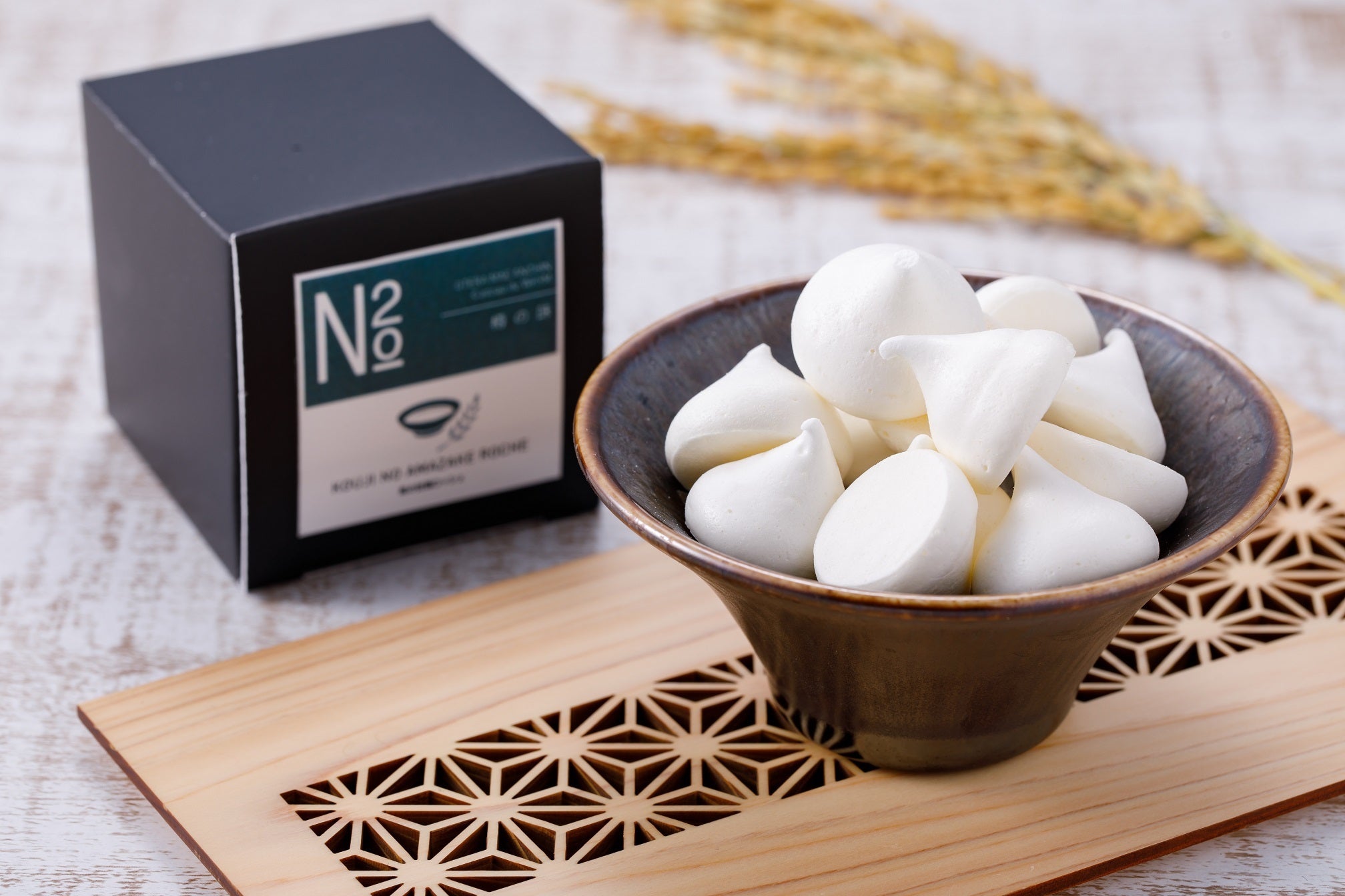 米麹と米のみで発酵させた甘酒は、古来から日本人に親しまれ、古くは日本書紀にも登場するほどの長い歴史を持ちます。砂糖を一切使わず、発酵による糖化のみで得られる甘味は、上品で後味スッキリ。栄養価も非常に高く、近年では「飲む点滴」と称されるほどで、夏バテ予防や免疫力向上に高い効果を発揮します。今回はそんな甘酒をお菓子感覚で気軽に食べて頂きたいということで、メレンゲに合わせて焼き上げ、甘酒ロッシェに仕上げました。口に入れると、サクサク食感と共に、お米の風味と甘味が広がる上品な一品となっております。