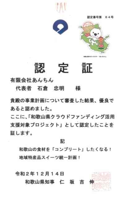 『和歌山県クラウドファンディング活用支援対象プロジェクト』として認定頂きました。