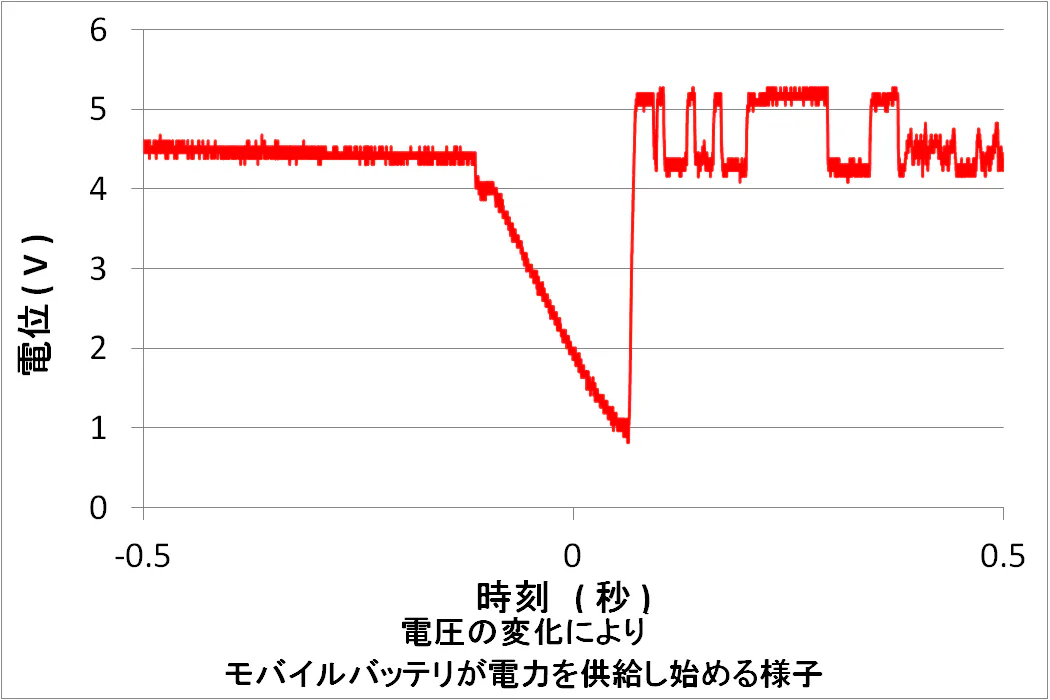 このメカニズムのおかげで、充電対象のUSB機器をすれば、自動的にモバイルバッテリからの充電が行われ、便利です。 しかし、すべてのモバイルバッテリが、この「バッテリーたたき起こし」に対応しているわけではありません。 また、充電対象のUSB機器が既に1台以上接続されている状態で、モバイルバッテリが、充電対象のUSB機器は満充電と判断し、電源供給を止めてしまった場合は、1MΩ程度を接続しても、USB出力ノードは高い電圧にはならないため、追加で充電対象のUSB機器を接続しても、「バッテリーたたき起こし」はしてくれません。 「バッテリーたたき起こし」が作動しない場合は、モバイルバッテリの電源ボタンを押して、手動で電源供給を再開してください。