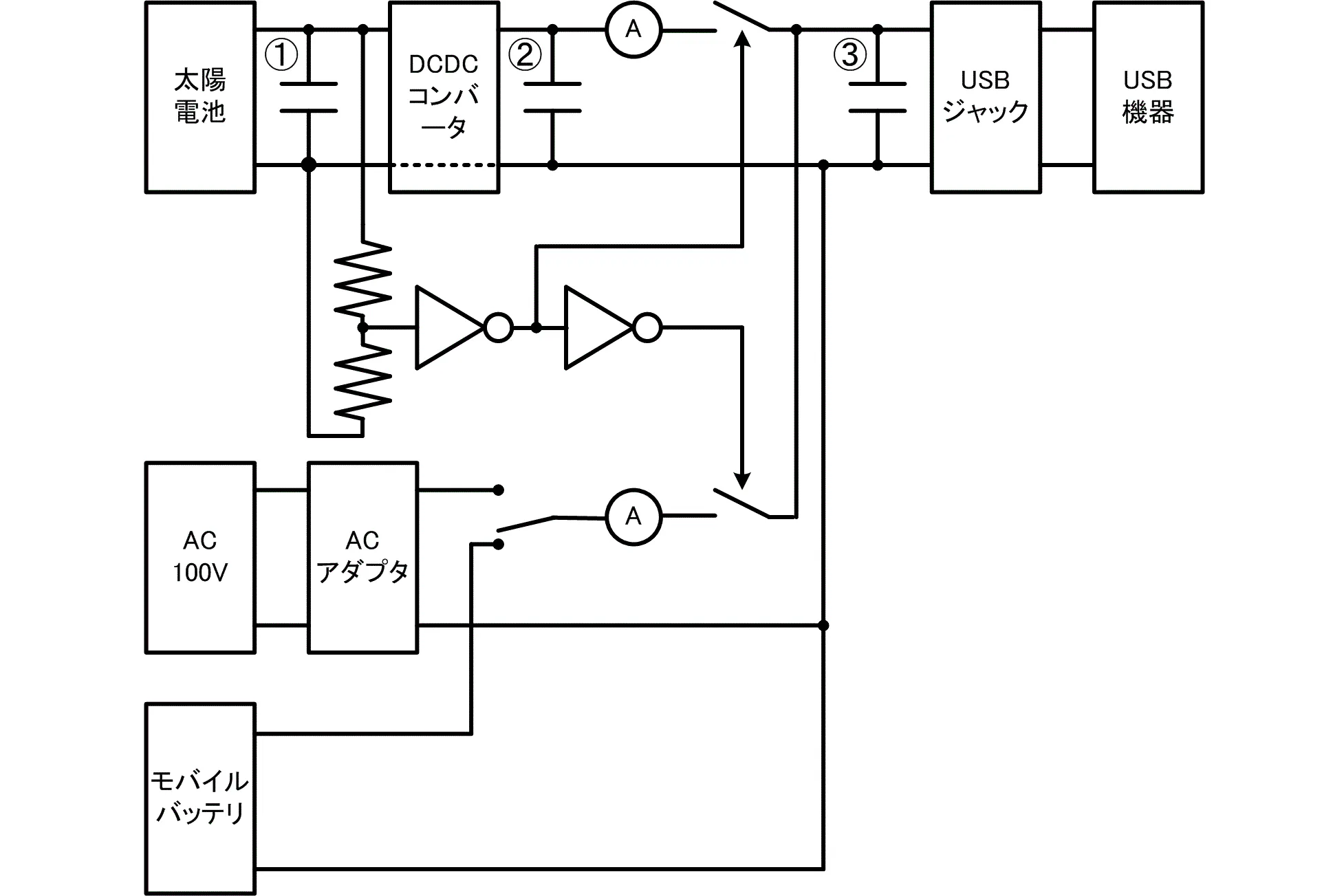 こちら(下)が、内部のシステム図です。 スイッチでの、ACアダプタとモバイルバッテリ間での切り替えにより、