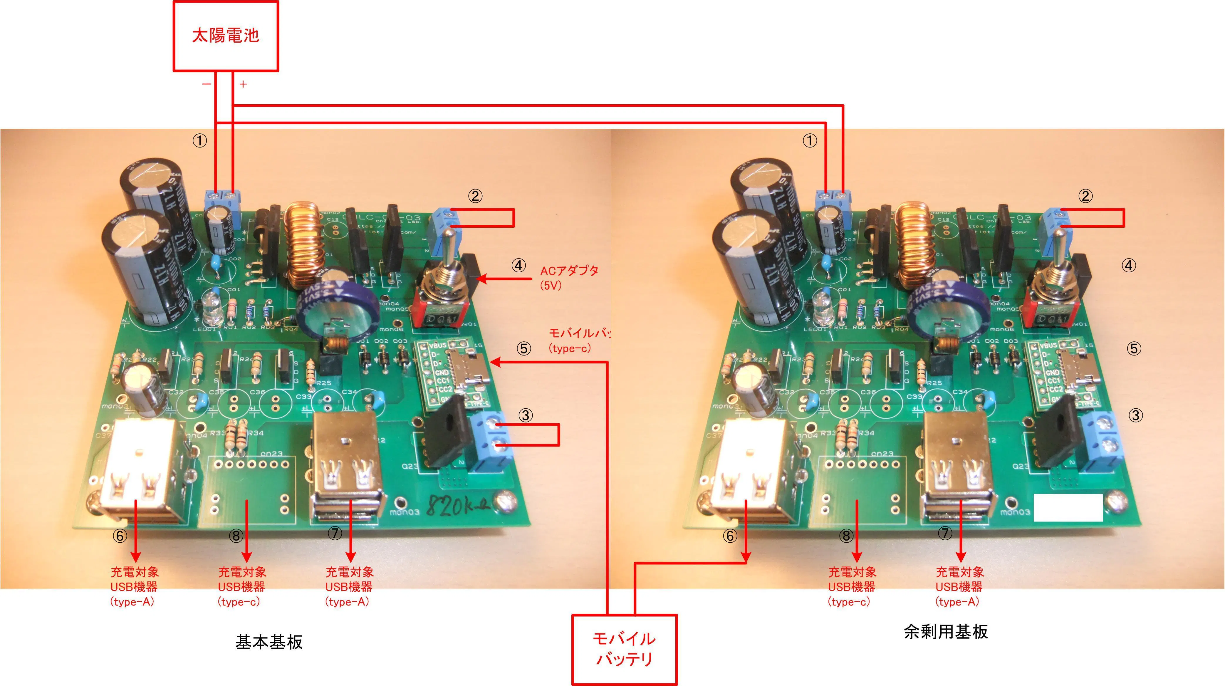 配線方法は、上の図の通りです。 基本基板と、余剰用基板の2つのプリント基板を用意します。 太陽電池の+側と-側をそれぞれ2つに分岐し、基本基板の①番端子台、余剰用基板の①番端子台に接続します。 写真の向きで、左側がマイナス、右側がプラスです。 余剰用基板の⑥番(または⑦⑧番)USB出力から、モバイルバッテリの入力にUSB配線で接続し、モバイルバッテリの出力を基本基板の③番のtype-cジャックにUSB配線で接続します。 基本基板の⑥⑦⑧番のUSB出力からの出力で、USB機器を充電します。 余剰用基板の⑥⑦⑧番のUSB出力からは、太陽光パネルからの電力が余っているとき電力が出力されます。
