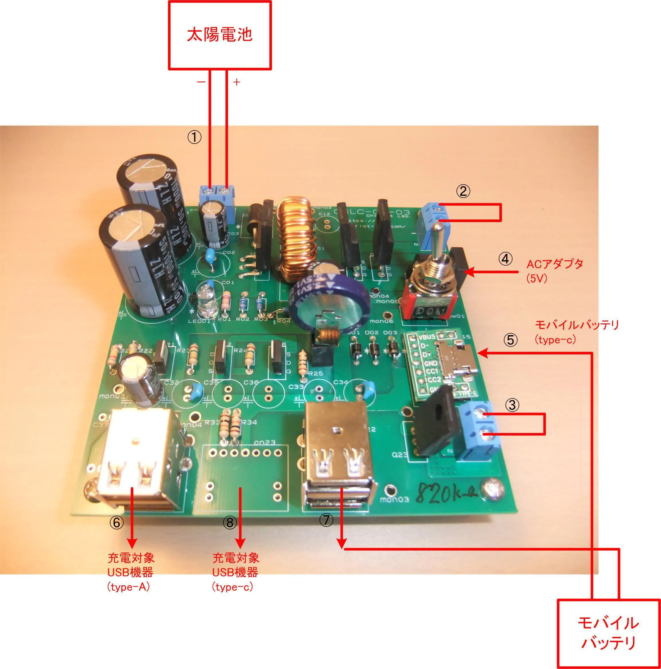 基板の⑧番(または⑥⑧番)USB出力から、モバイルバッテリの入力にUSB配線で接続し、モバイルバッテリの出力を③番のtype-cジャックにUSB配線で接続します。 ⑥⑧番のUSB出力からの出力で、USB機器を充電します。 これだけで、モバイルバッテリを蓄電装置とした独立電源システムが構築できます。 この方法では、モバイルバッテリと他の充電対象USB機器の優先順位は同じになります。 モバイルバッテリより他の充電対象USB機器を優先的に充電したい場合、プリント基板を2枚用意し前回紹介した応用編をご検討ください。 鉛蓄電池を使った独立電源システムより軽量です。