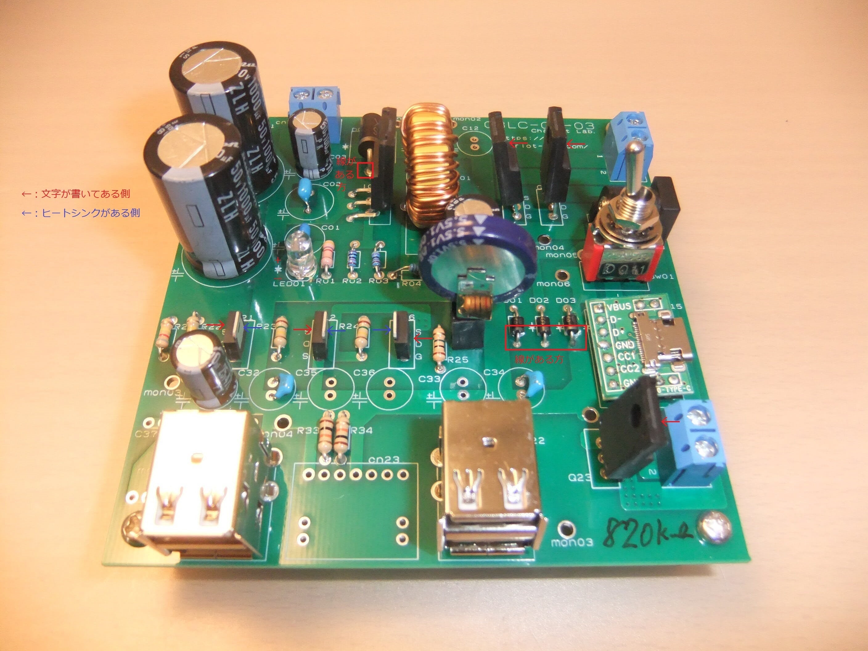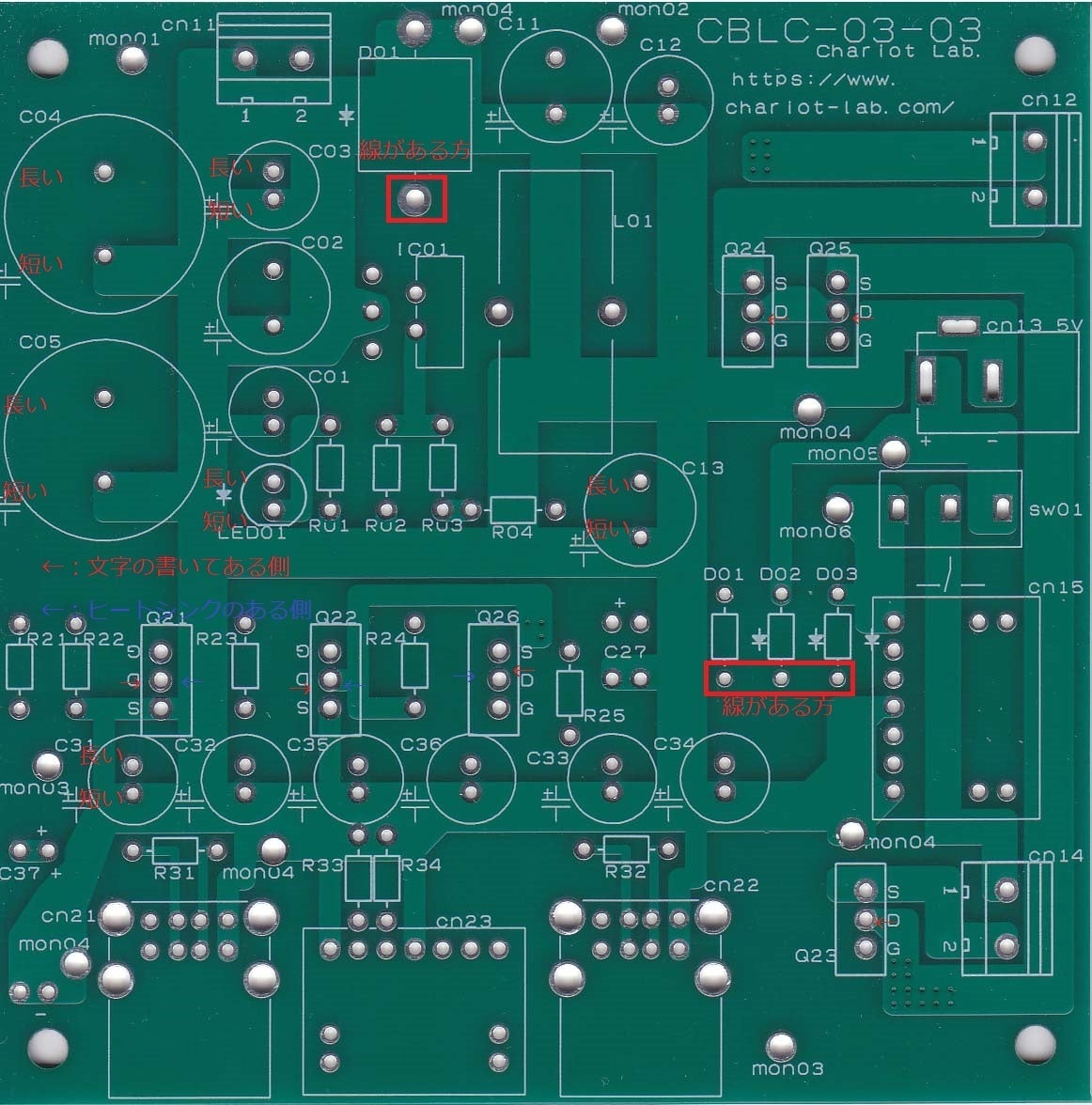 上記がその画像です。電界効果トランジスタ(FET)、ダイオード、発光ダイオード(LED)、電解コンデンサについて、向きを記載してあります。 ご参考にしてください。 電界効果トランジスタ(FET) は、赤い矢印の方が文字の書いてある側、青い矢印の方がヒートシンクのある側です。 発光ダイオード(LED) 、電解コンデンサの足は長い方がプラス、短い方がマイナスです。 ダイオードは、線の入っている方がカソードで、写真では下側です。 特に電解コンデンサは、極性を逆にすると爆発の恐れがありますのでご注意ください。 下にダウンロードアドレスを記載します。 ダウンロードし、できるだけ大きな画面でご覧ください。