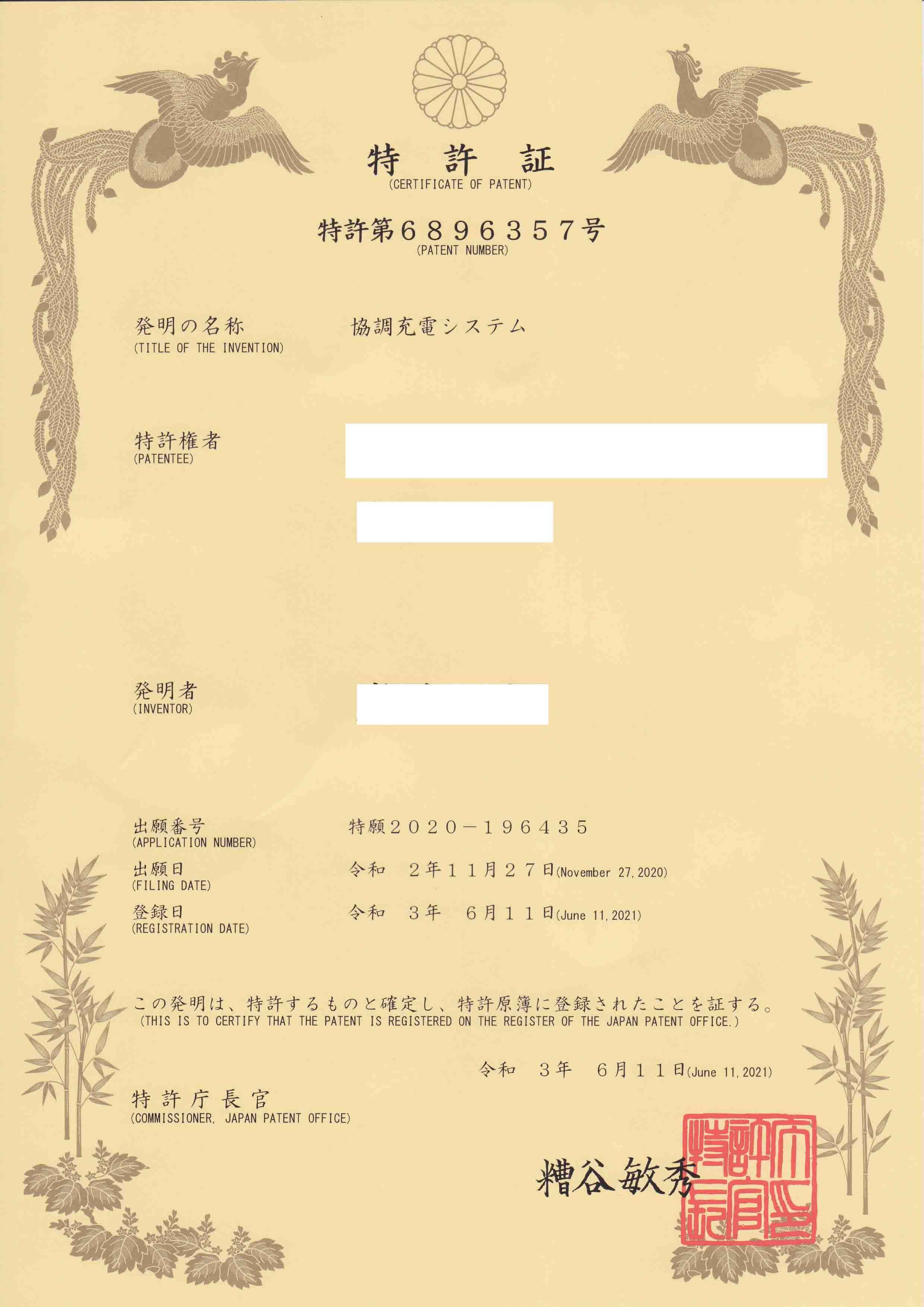 さて、特許が登録に至りました。 「100%に近い時間協調充電システムに電源を供給する工夫」「バッテリーたたき起こし」の特許に関してです。 登録番号は「特許第6896357号」です。