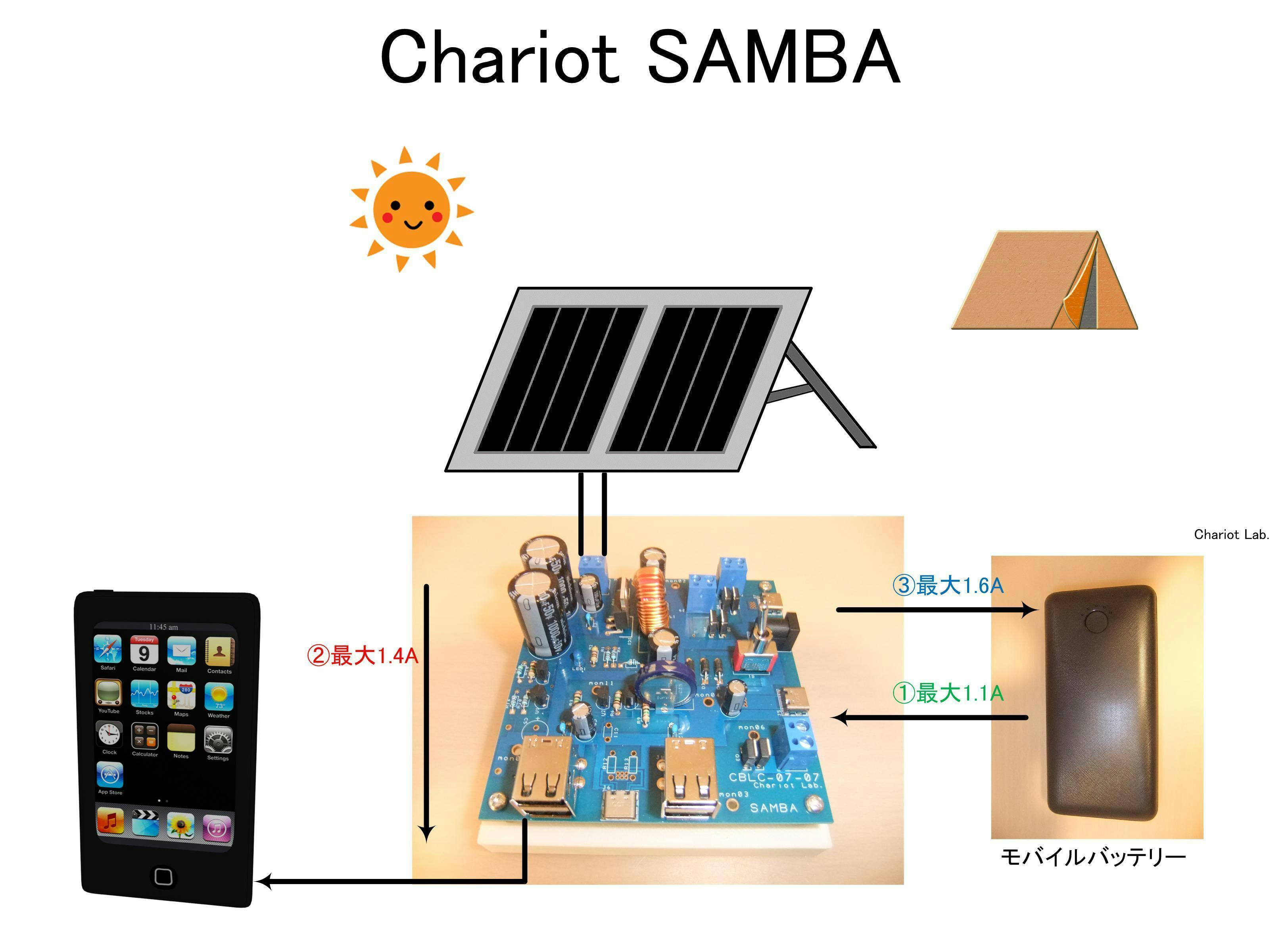 キャンプに行ったときに太陽光を用いて発電しスマートフォンを充電するお供にどうぞ。 SAMBA(Solar And Mobile Battery Assistant)は重い鉛蓄電池不要で、太陽電池やモバイルバッテリとともに、どんな天候状況でも賢くスマートフォンを充電します。