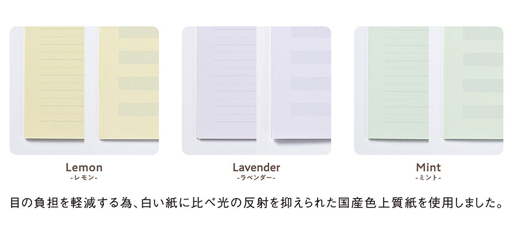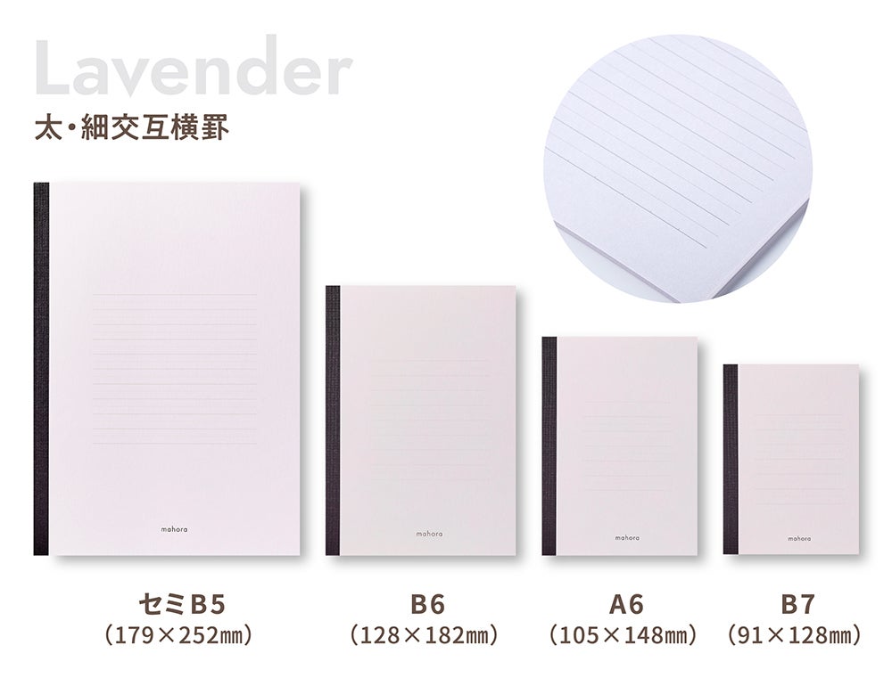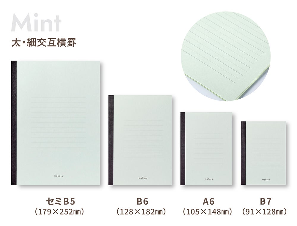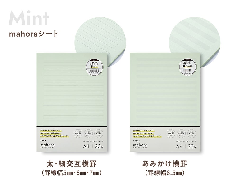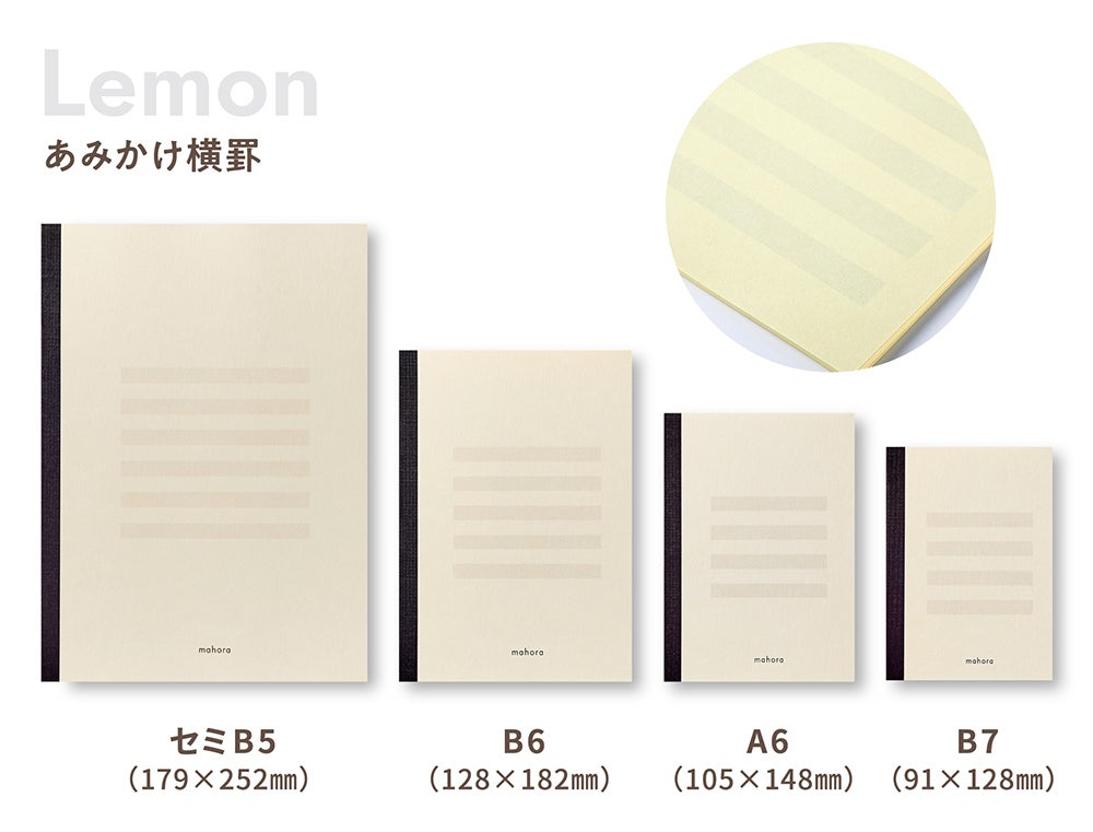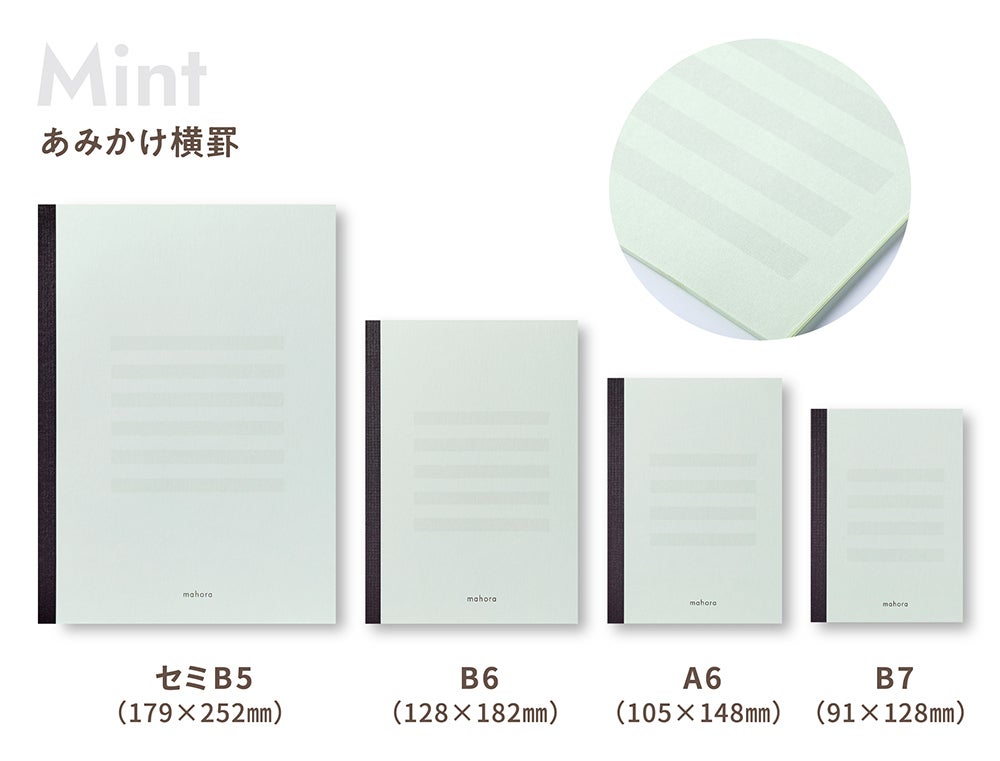 今回は『mahora(まほら)』レギュラー商品 「レモン」 「ラベンダー」 に加えて、新色の 「ミント」 と、ご要望の多かった「小さいサイズのノート」、「A4サイズのシート」を新ラインナップに加え発売させていただきます。