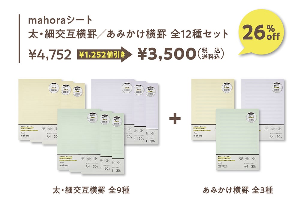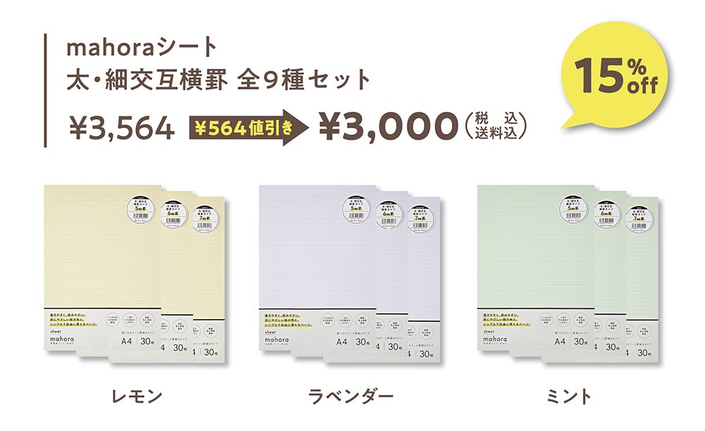 太・細交互横罫の各罫線幅(5㎜・6㎜・7㎜)とあみかけ横罫の各色(レモン・ラベンダー・ミント)の12種のmahoraシートがセットになったお得なリターン