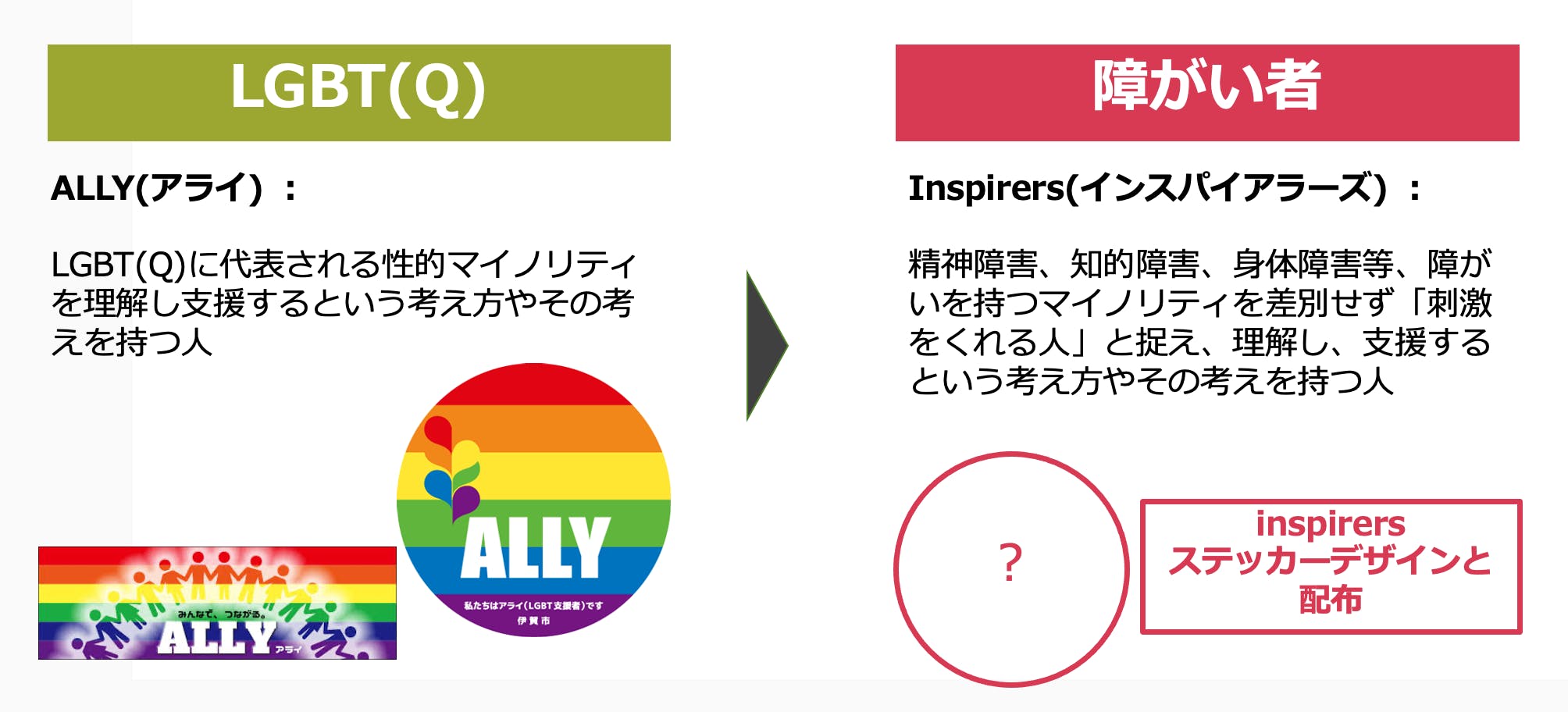 今回、全てのリターンに共通するものとして、特筆したいのは、本プロジェクトの先輩的立ち位置として参考にさせていただいた、LGBT(Q)のALLYマークに倣っての、Inspirers(インスパイアラーズ)マークのステッカー制作と頒布です。