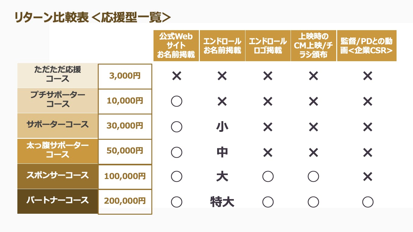 リターンには、大きく分けて、純粋に「応援」するタイプ(黄色タイプ)のものと、自らこの動きを推進したり社内に取り入れ「参画」するタイプ(赤タイプ)のものとをご用意しています。