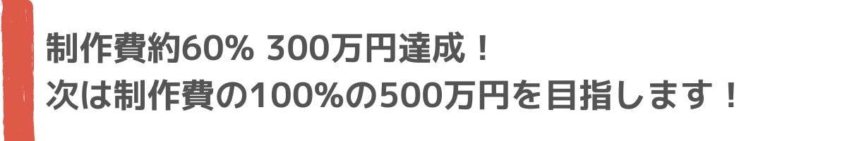 多くのご支援をありがとうございます!応援メッセージでも共感のお声をいただき感無量です。おかげさまで、制作費の約60%に当たる300万円を突破出来ました...!本当に有難うございます!