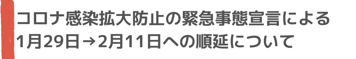 2月11日への順延では参加できない方への救済措置に付きましては、別途、個別にてご連絡させていただいておりますので、ご確認いただければ幸いです。