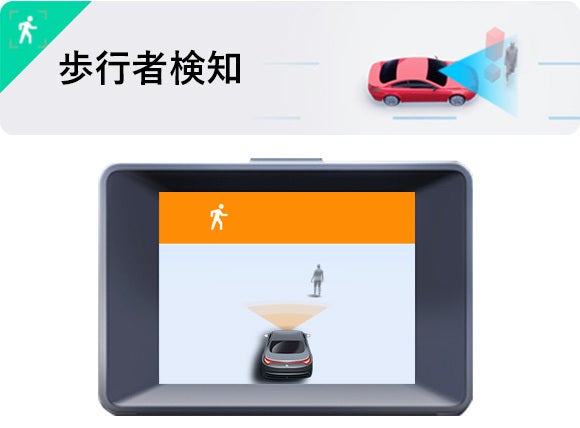 車両のフロントガラスに取り付けたカメラが、前方の車両・オートバイ・歩行者・自転車・車線を検知。