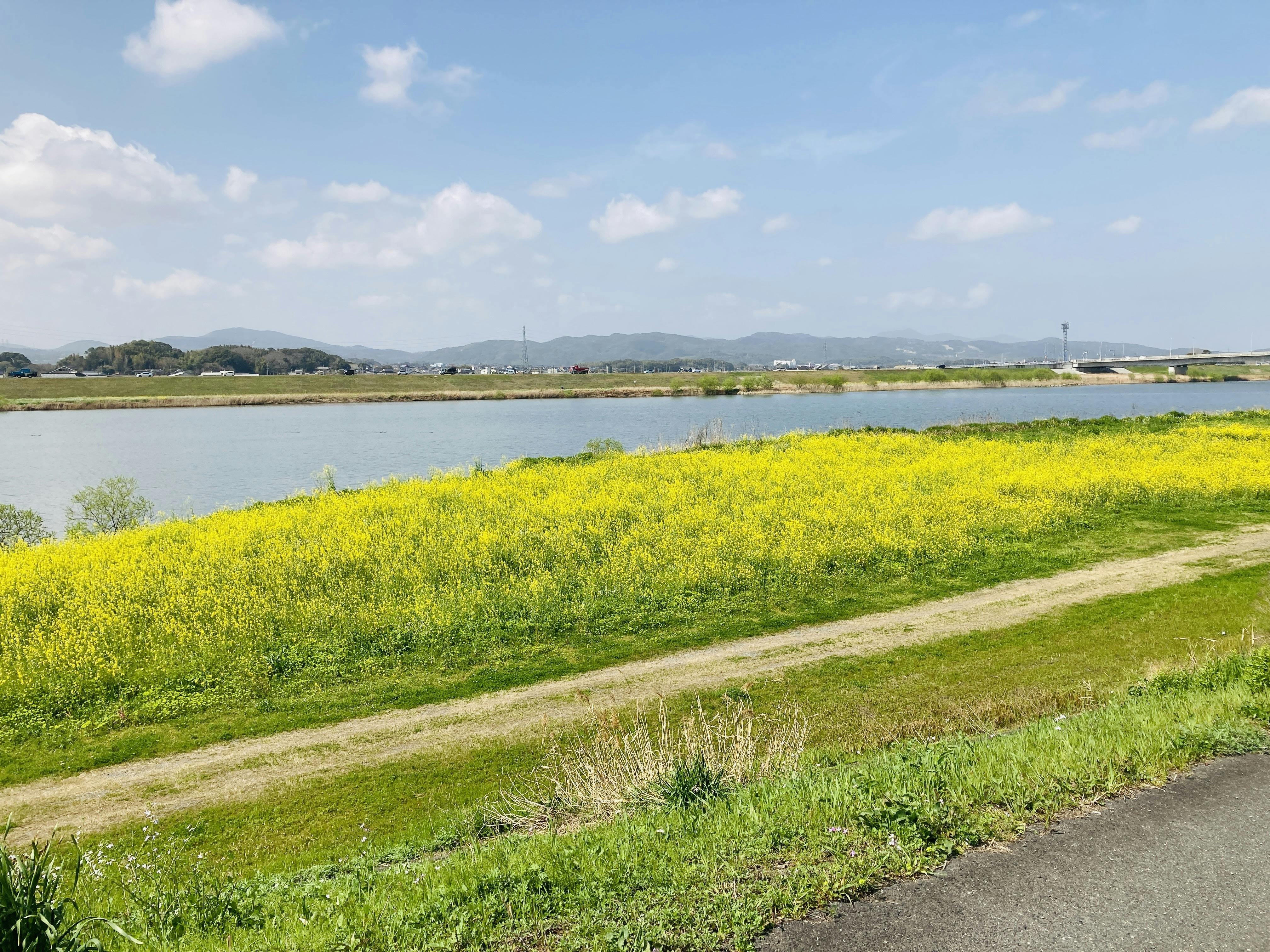 昨日、直方から中間市に帰る途中の遠賀川の風景です。菜の花が延々咲いています。