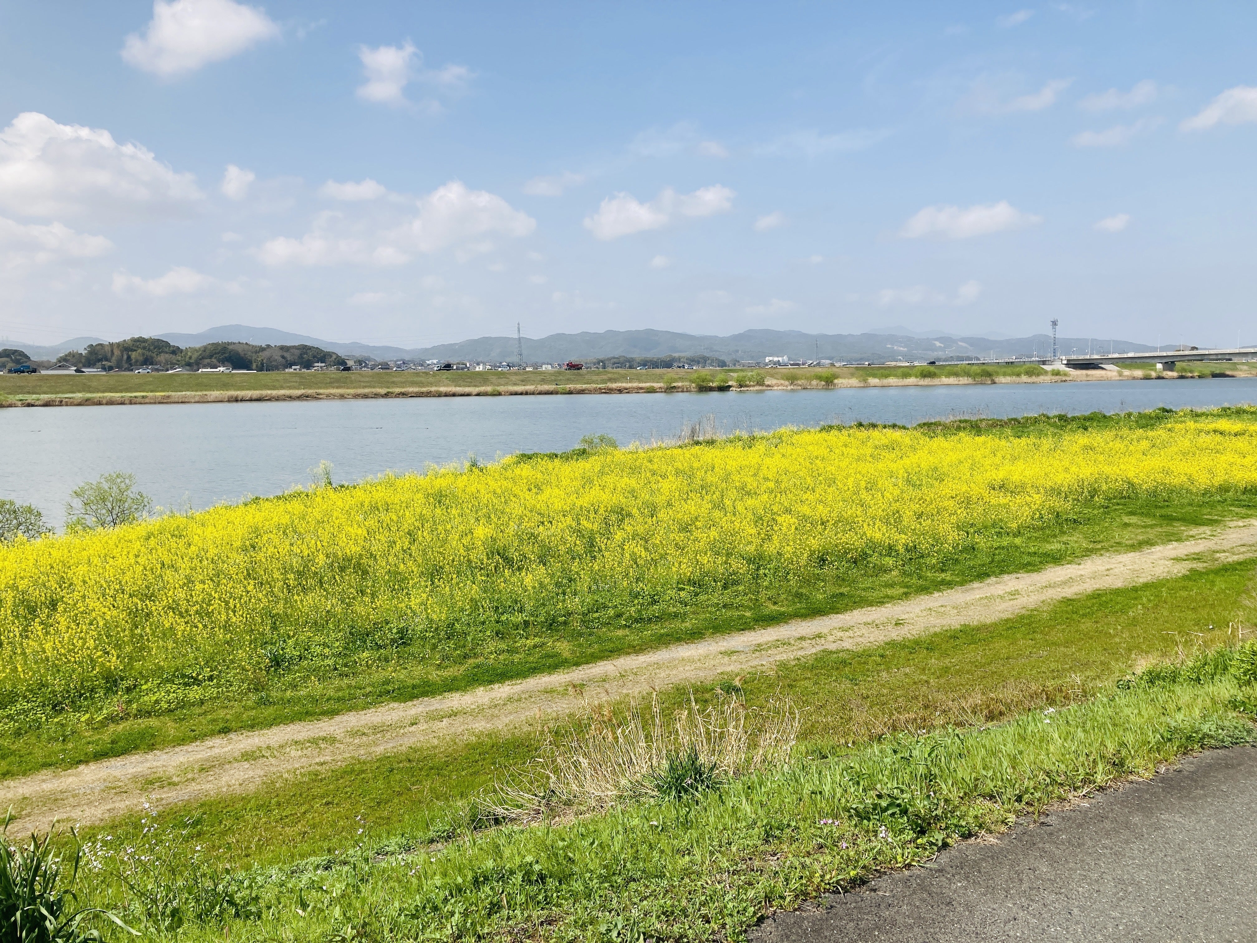 昨日、直方から中間市に帰る途中の遠賀川の風景です。菜の花が延々咲いています。土手に降りたいけど降りる場所はチェーンがかけられ降りれないようにしてます。そこに駐車して魚釣りを楽しんでいる人もいましたが〜駐車できるスペースがないのが残念でした。まあ、遠くから眺める方が良い場合もありますけどね!