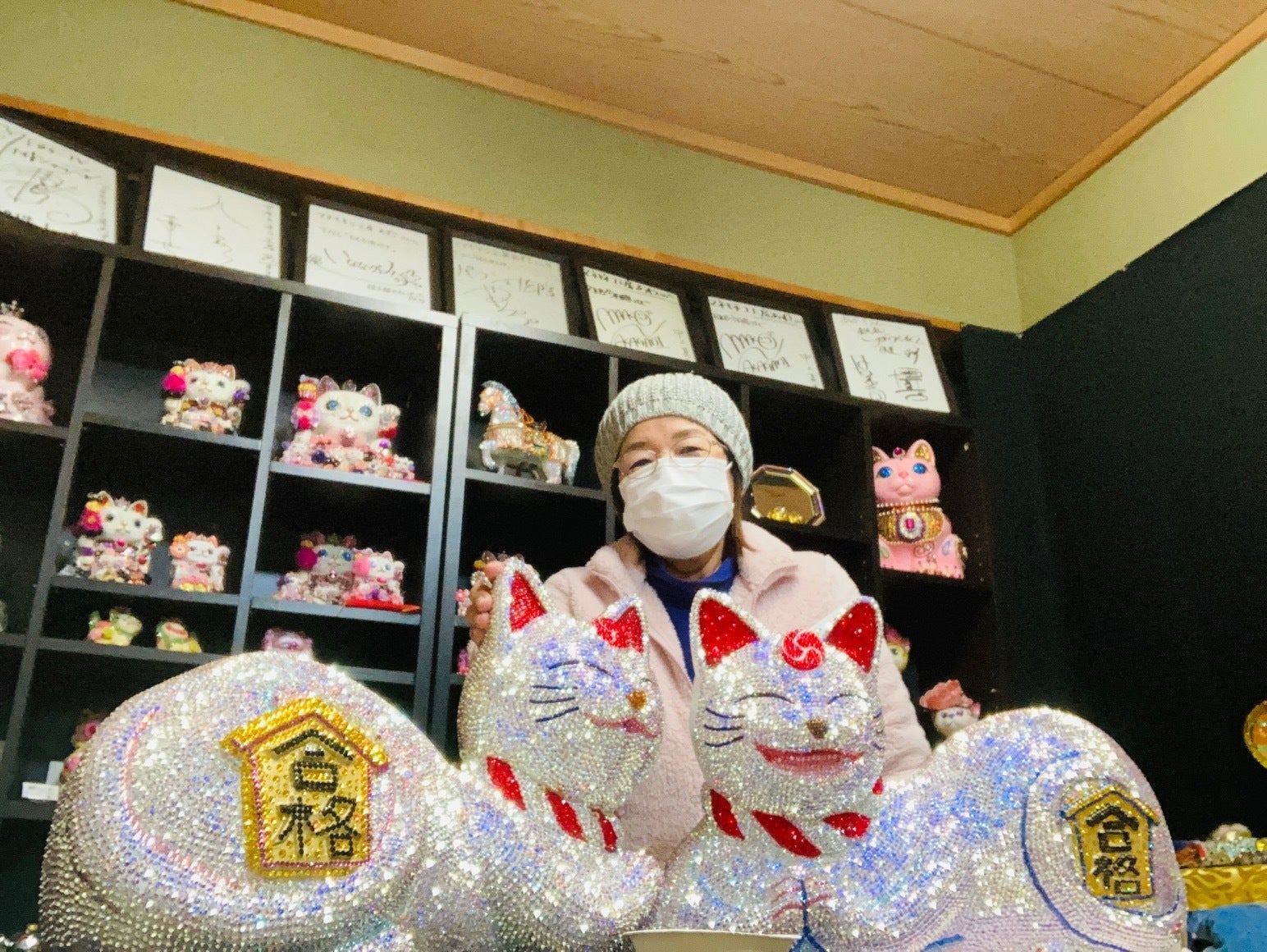 昨年末にfacebookで知り合った中間市の市議会議員梅澤やすのりさんが合格祈願招き猫の見学でいらっしゃいました。その時はお互いの自己紹介で私の次男と同じ大学の後輩であると知りました。招き猫も一体目を製作中でしたが、二月にいらした時は2体目で記念のデコ貼りをしていただきました。とっても難しそうでした。