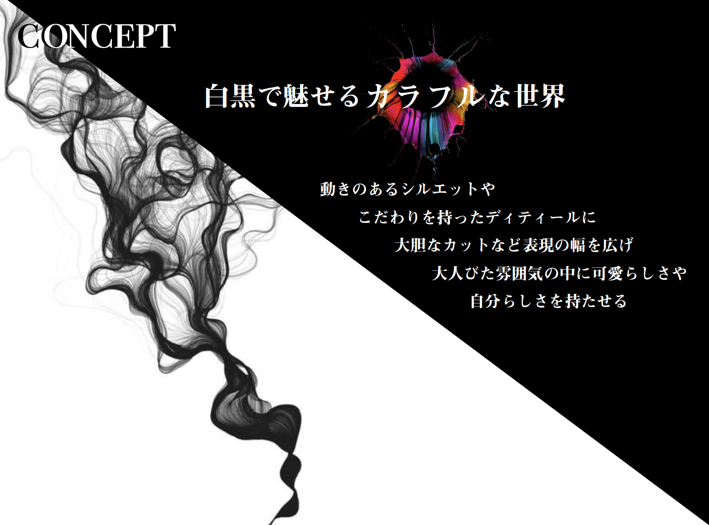 『白黒で魅せるカラフルな世界』をコンセプトに濃淡による表現の可能性の拡大を目論んでいます。情報化社会で生きる私達にとって余計な情報をシャットアウトすることで新たな発見の兆しになるかもしれません。BLANC NOIRの商品を通してモノクロの世界を体感していただきたいです。
