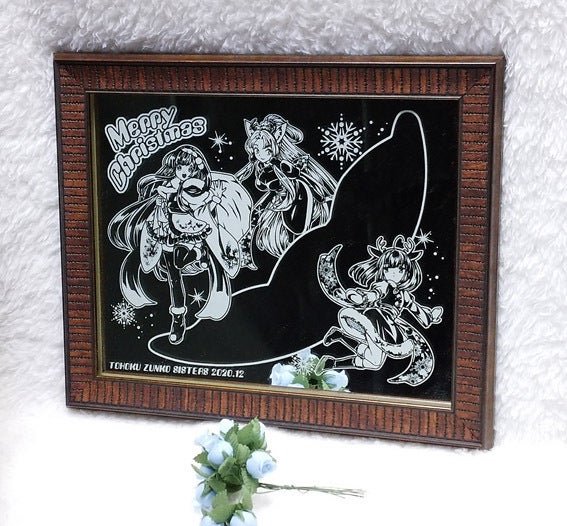 イタコ姉様のグラスができました!記念ミラーもたいそう可愛くできてます。手前のお花が映り込んでいるのがわかりますか?こちらはA4サイズ程度の大きさで、額縁のデザインはランダムになります。