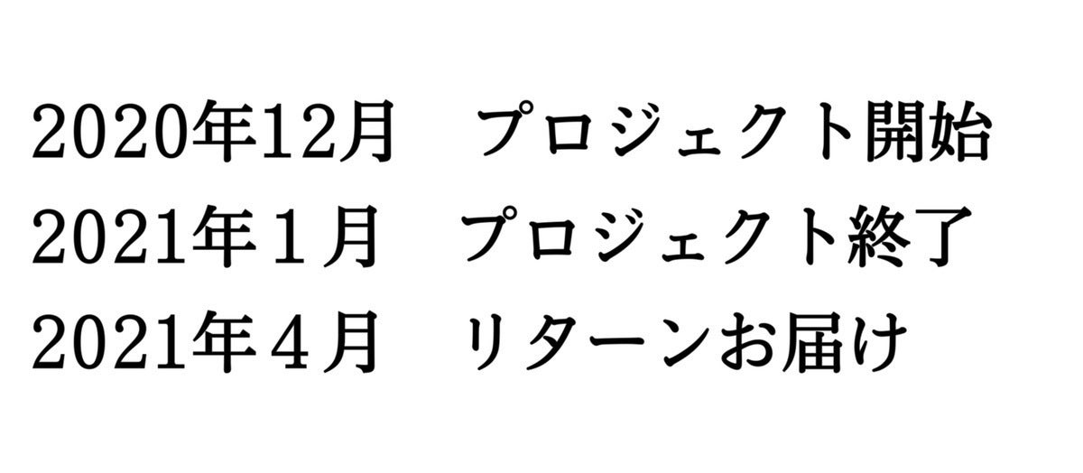 ● 商品引渡しまたは役務提供の時期:各プロジェクトが募集期間内に成立した場合のみ、支援金の決済が行われ、約定されたリターンを得る権利が発生します。なお、リターン毎の発送(履行)時期は各プロジェクトの記載・連絡に準じます。諸般の事情により遅延・遅配が生じる場合は、プロジェクトオーナーより記載・連絡されるものとします。