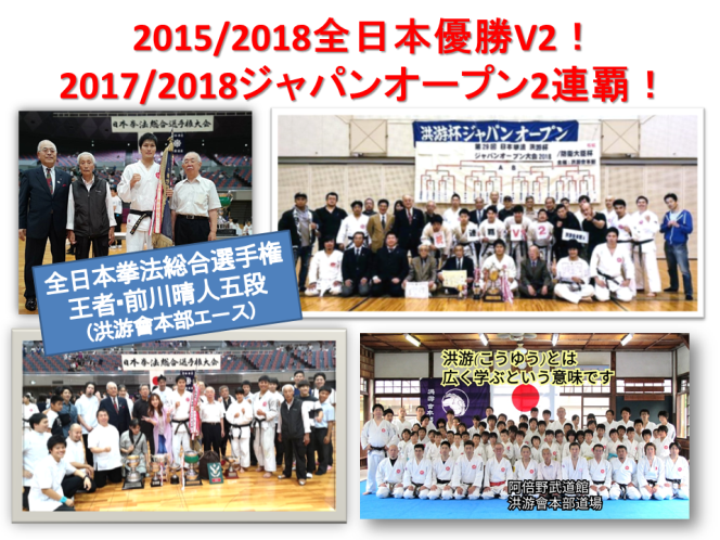 過去に様々な団体戦戦績や、優勝選手、プロ選手を輩出した洪游會本部道場は、近年、2018年にも全日本拳法総合選手権優勝選手を輩出し、同年、ジャパンオープン/防衛大臣杯も二連覇、2019年の全国都道府県団体大会でも優勝の中心を担いました。