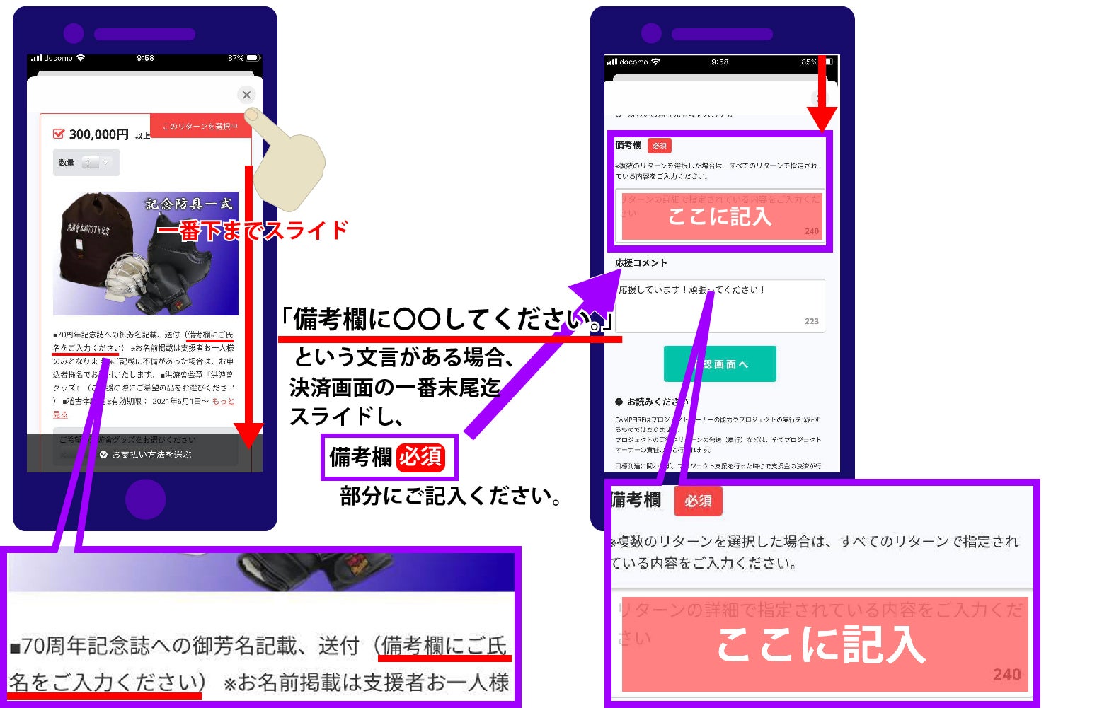 リターン決済時の、リターンの備考欄必須についての説明