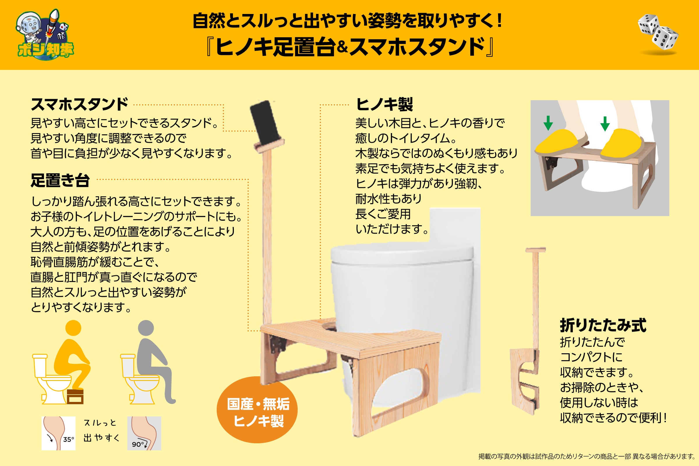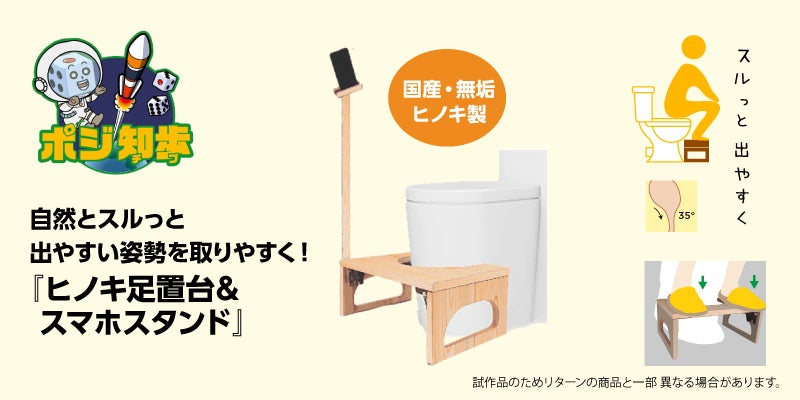 さらに、もっと快適なおトイレタイムに役立つアイテム『ヒノキ製の足置き台&スマホスタンド』とウンチの色や形などで健康チェックするための『ウンチ健康手帳』をセットしたリターンもご用意。