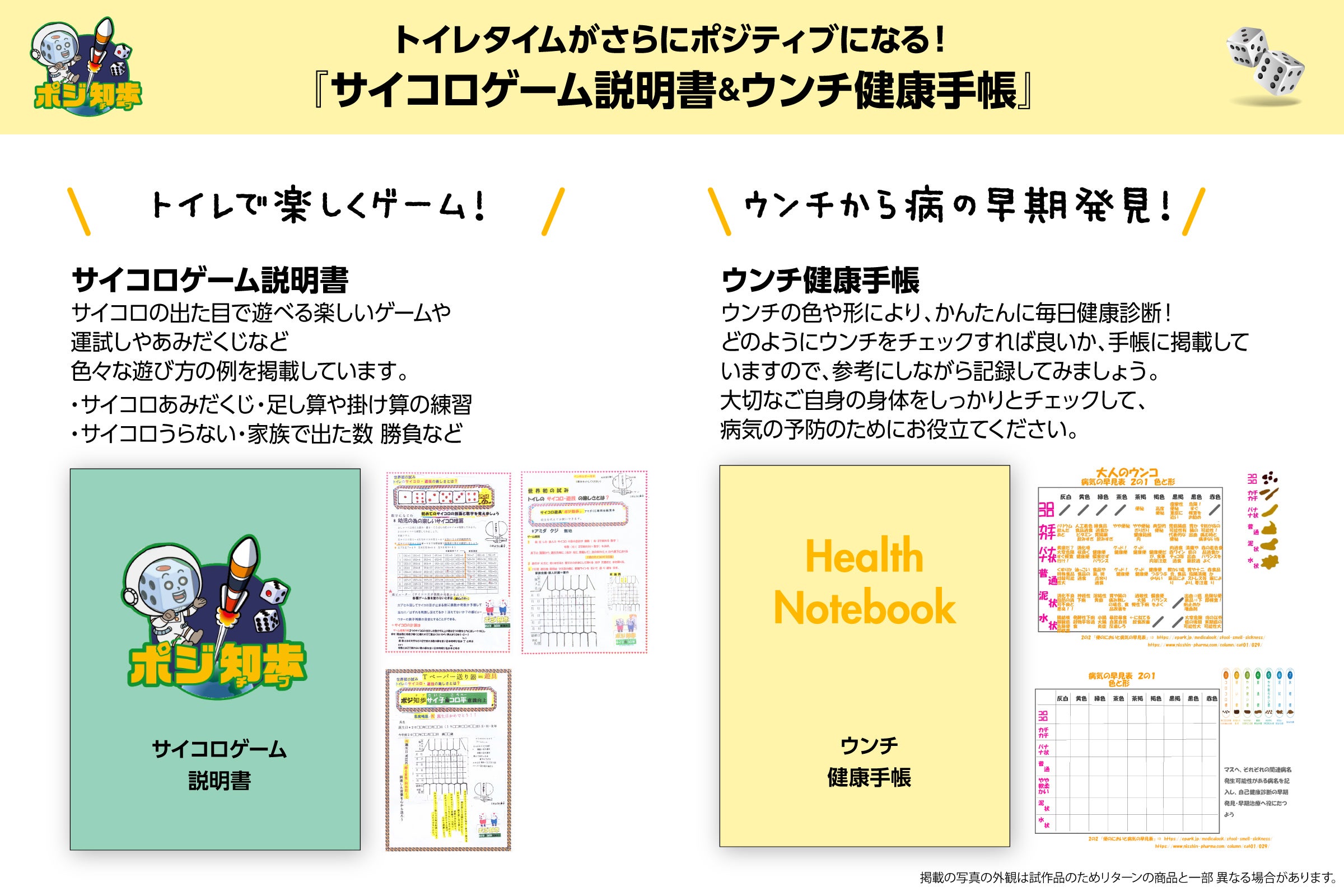『ポジ知歩(ポジチブ)』と『サイコロゲームの遊び方説明書』、『ヒノキ製の足置き台&スマホスタンド』と『ウンチ健康手帳』全てのアイテムがセットになったリターンもございます。