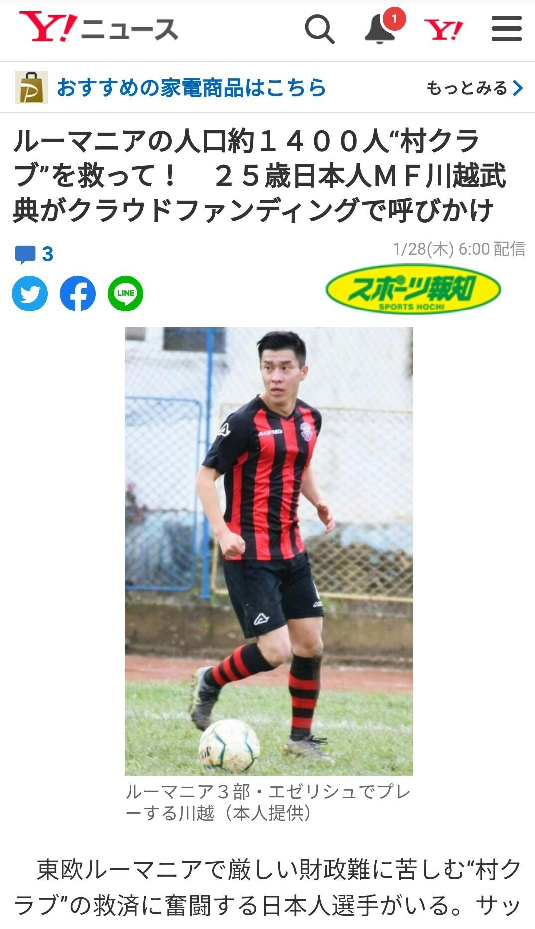題名は「ルーマニアの人口約1400人“村クラブ”を救って! 25歳日本人MF川越武典がクラウドファンディングで呼びかけ」です。ウェブニュースサイト及び新聞にも掲載されました。
