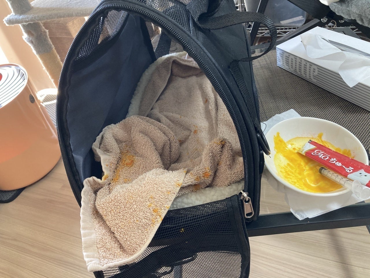 固形物のごはんをまったく食べられない状態で、高価な薬もカプセルでの投薬が嫌がってしまい飲んでくれず、カプセルの中身をチュールに混ぜて注射器で口腔投与を試みるものの、カリラは大変嫌がり無理やりに飲ませる格闘を毎日2回、各1時間程度行う日々が始まりました。なんとか一部飲ませることに成功していますが、嫌がることを無理に行う猫と飼い主の両方のストレス・・・いつ死んでしまうか分からない容態、もし今回も助けられなかった時を想像した時の自分、本当に精神的に辛いです。
