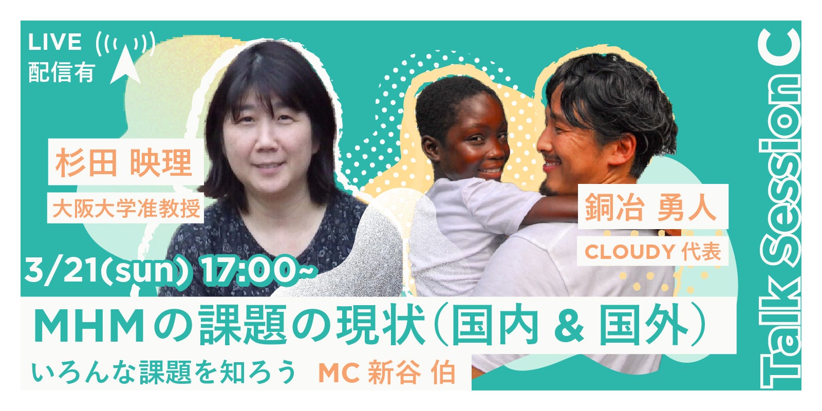 日本においてMHM研究の第一人者である杉田氏と、循環型ビジネスモデルを考案され途上国におけるリアルな支援活動を行っている銅冶氏のセッション。お二人は主にアフリカなどの途上国をフィールドにご活躍されています。<途上国のリアルな現状、現地を尊重し本質を正しく知ること、そこからのアクションは?> え?そうだったのか?と目から鱗なお話がたくさん聞けるチャンスです。