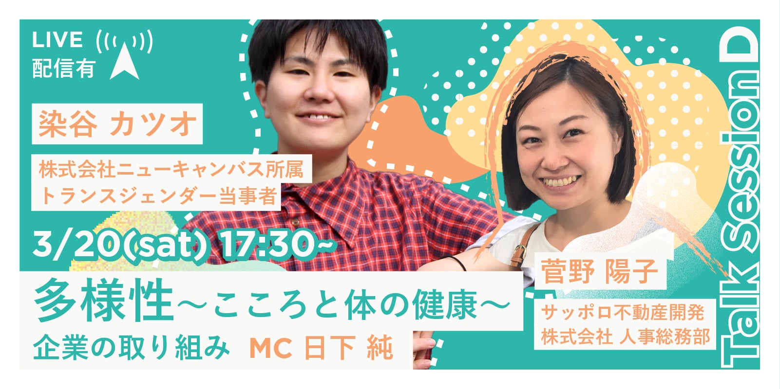 サッポロ不動産開発株式会社より菅野陽子さん。LGBTQ活動家の染谷カツオさん。社員のこころと体の健康。個々のモチベーションやパフォーマンスをあげるために、企業はどうのようにサポートしていくのか。そしてあなたがもし就職/ 転職で企業を選ぶ時、どんなことを考えますか?これからの社会に向けて、興味深い話題が詰まったセッションです!