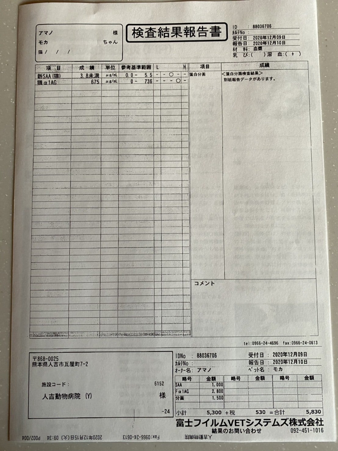 本日、外注に出していた血液検査の結果を送ってもらいました。それを協力病院の先生に送り、先に送っている検査と合わせ、確認してもらいます。